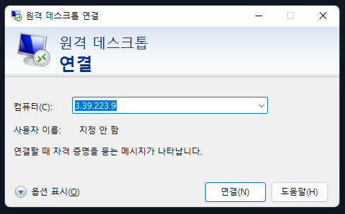 위 사진처럼 원격 데스크톱 연결이라는 창이 뜨게 된다.