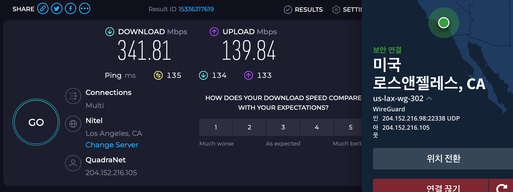 Mullvad VPN은 멀티홉 기능을 사용하지 않아도 진출입로의 IP가 다르다.