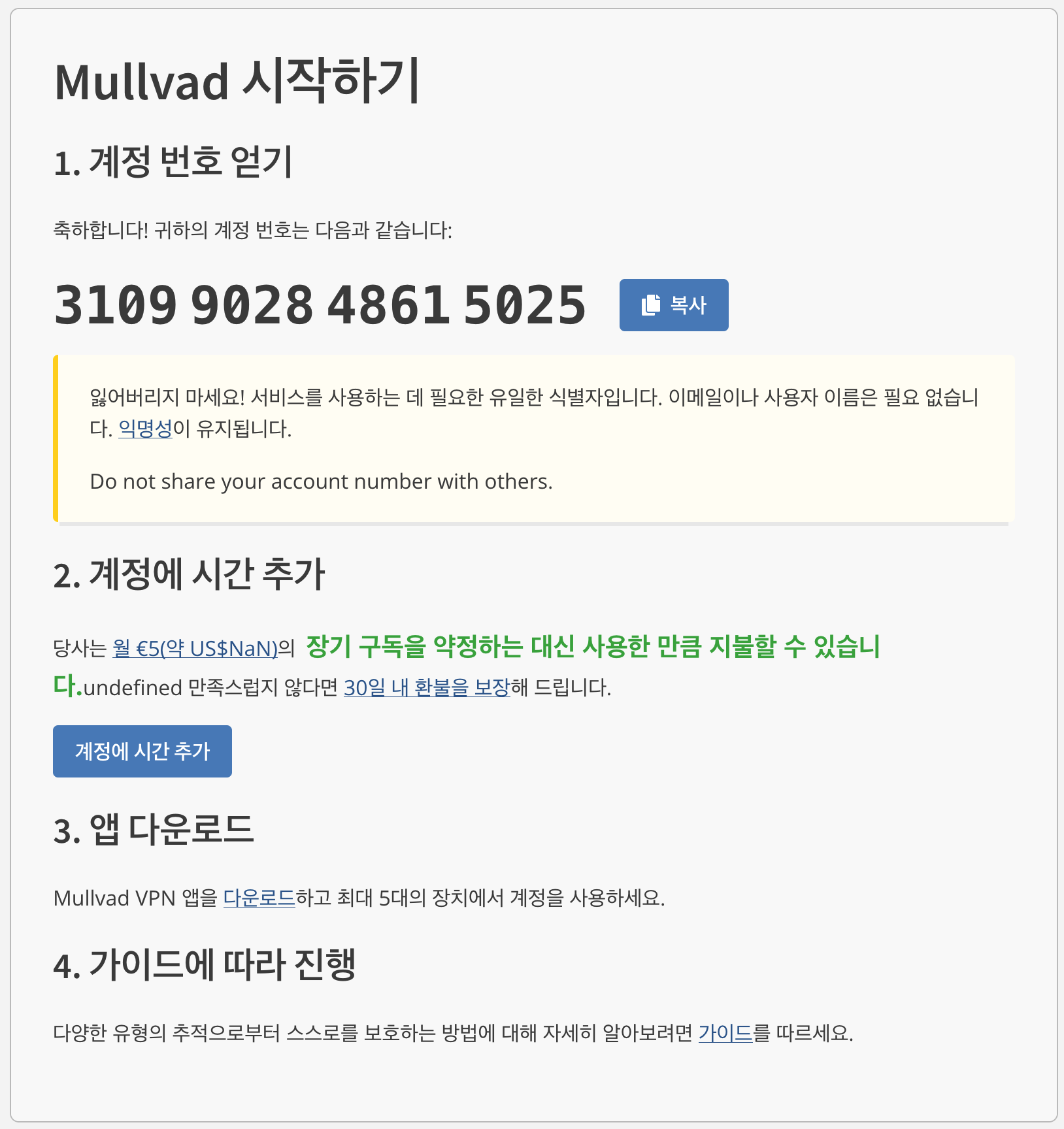 대신 Mullvad를 가입할 때 위 사진처럼 16자리 계정 번호를 던져준다.