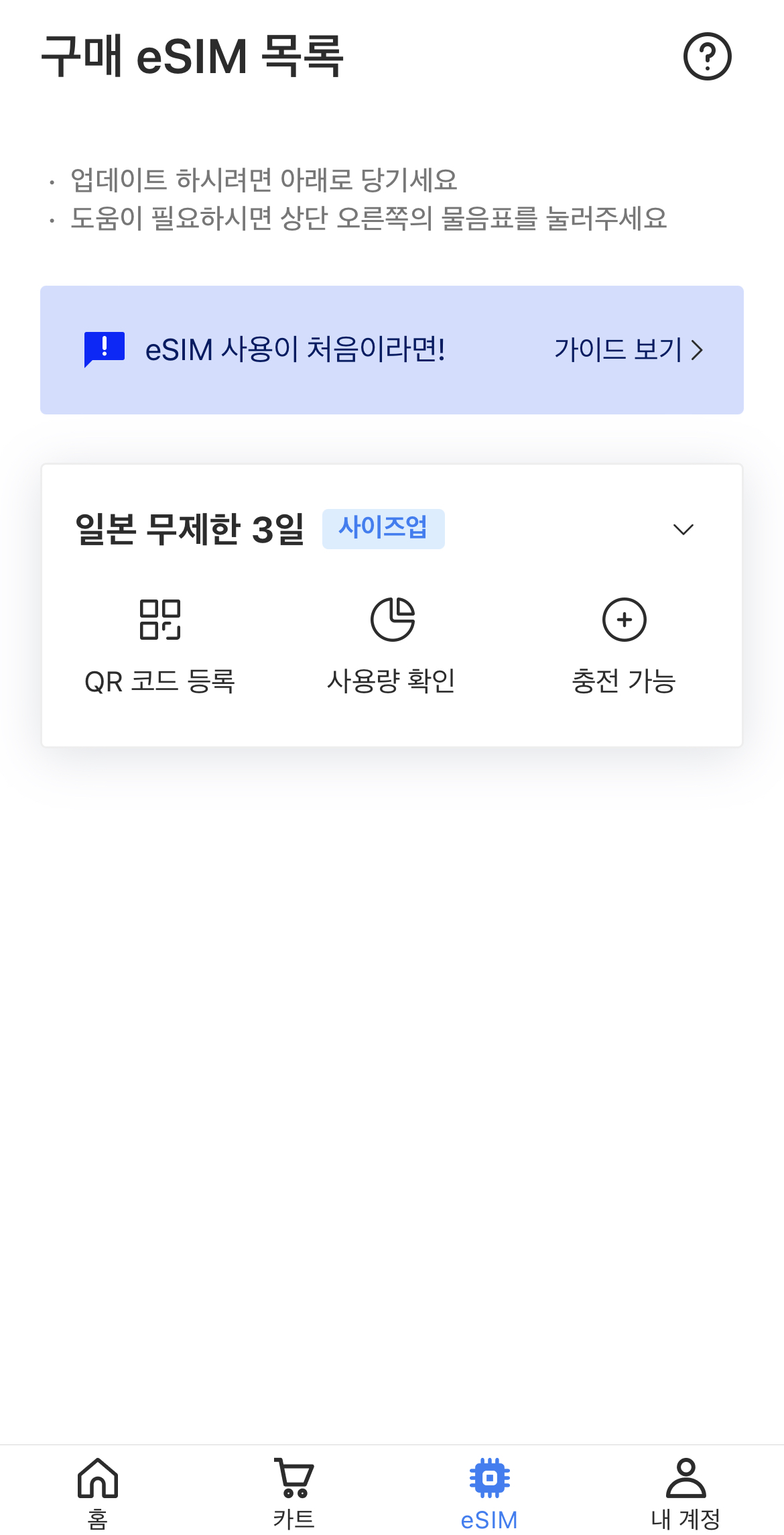 구입을 하면 1분 이내로 eSIM 메뉴에 등록할 수 있는 QR 코드가 생긴다. 이메일로도 발송된다는데 필자는 받지 못했다.
