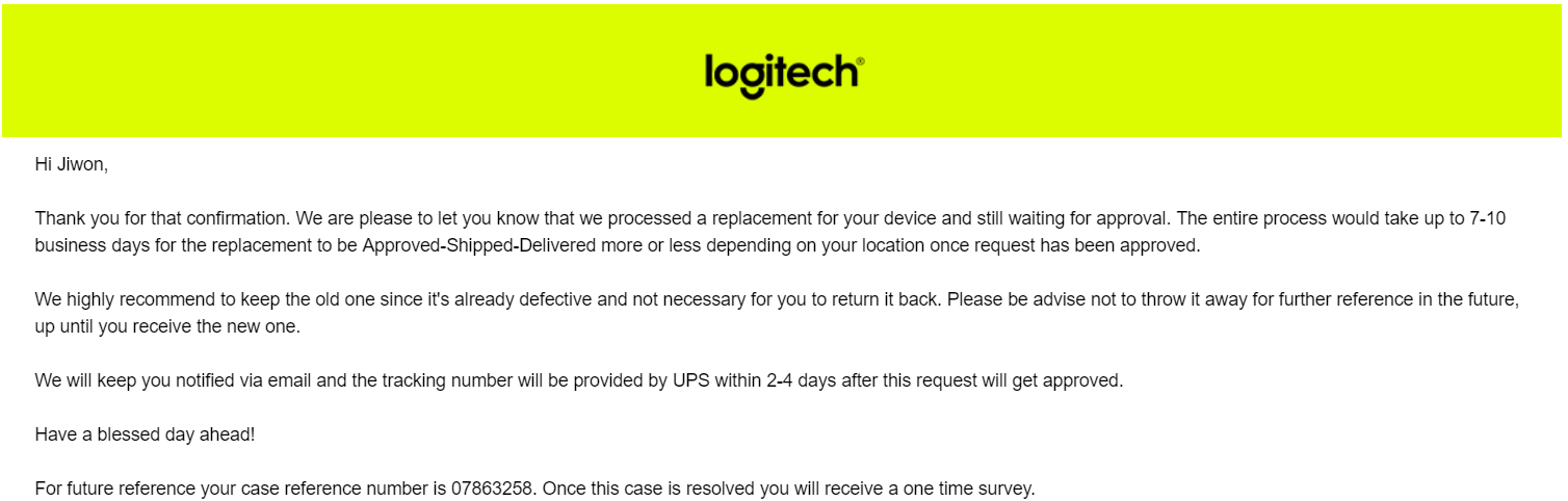 한국 제품이 아니라서 배송대행지에서 한국까지의 시간을 제외하면 (미국) 로지텍의 RMA 진행 절차는 매우 신속하고 친절했습니다.