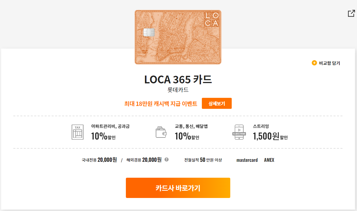 카드고릴라에서 카드 발급 이벤트를 보던 중 롯데카드의 LOCA 365 카드를 발급하고 이용하면 최대 18만원을 준다는 소식에 발급 받았다.