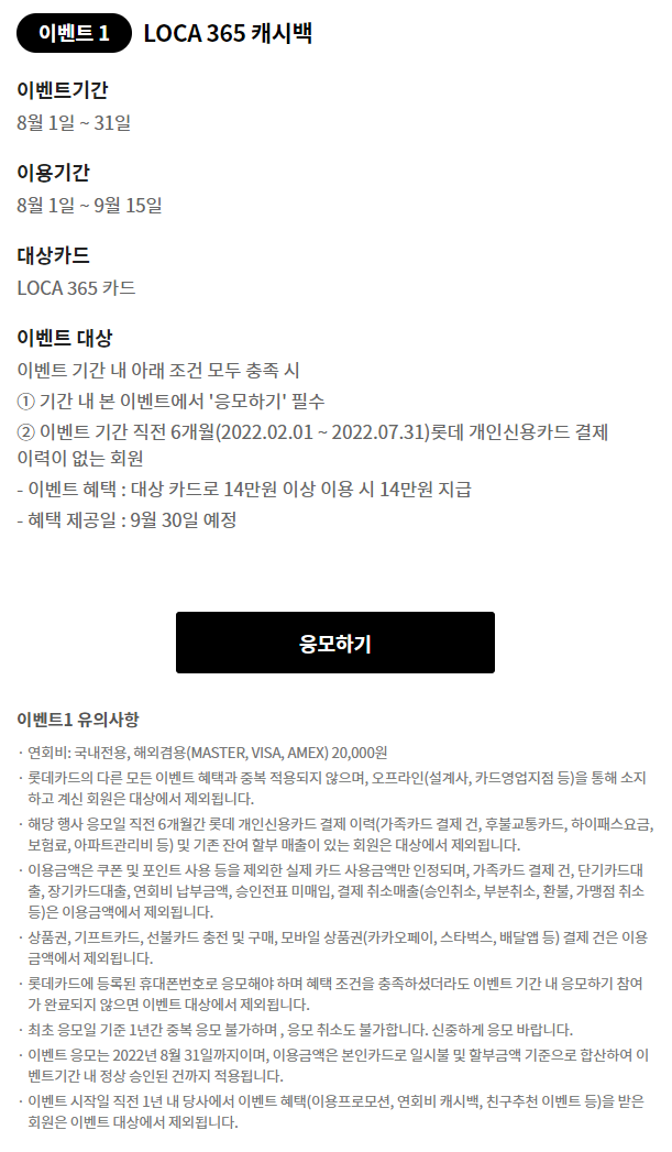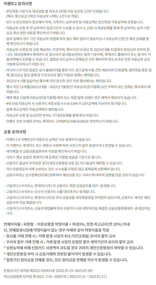 유의사항을 보면 6개월 간 롯대신용카드 결제 이력이 있거나 1년 내 이벤트 혜택을 받는 고객은 대상자가 아니니 꼭 유의사항을 확인하자.