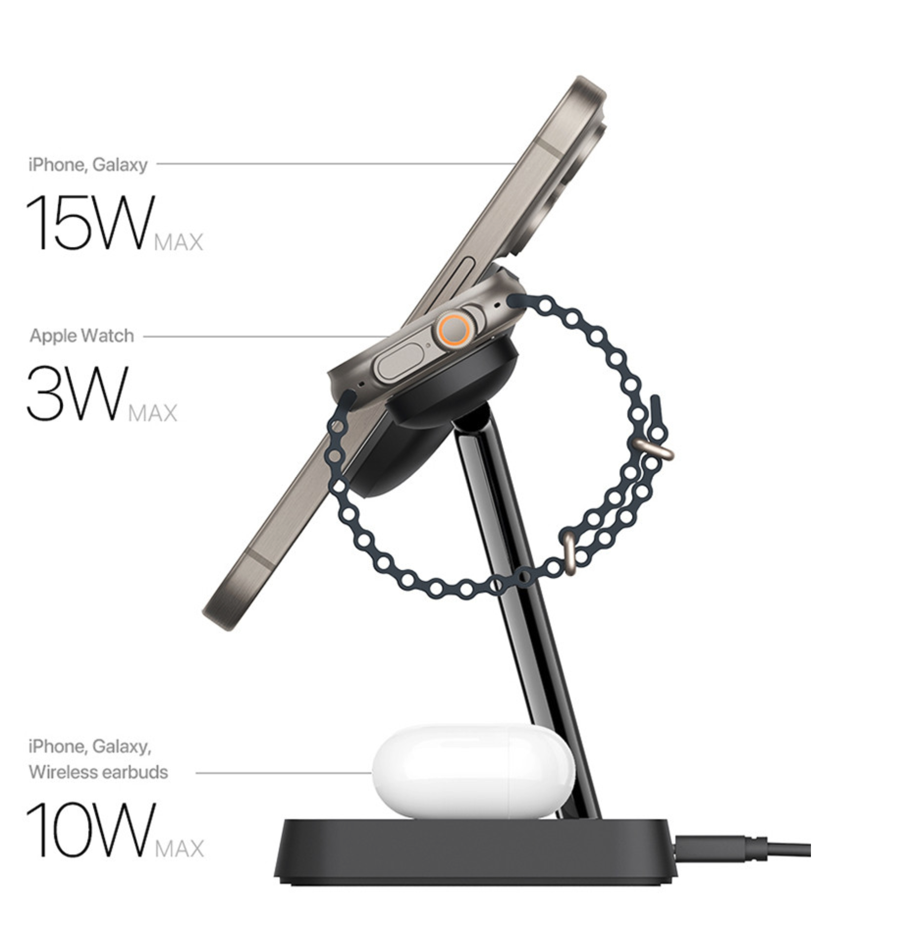 맥세이프 충전부는 15W, 애플워치 충전부는 3W, 하단 무선 충전부는 10W로 총 28W 출력을 지원한다.