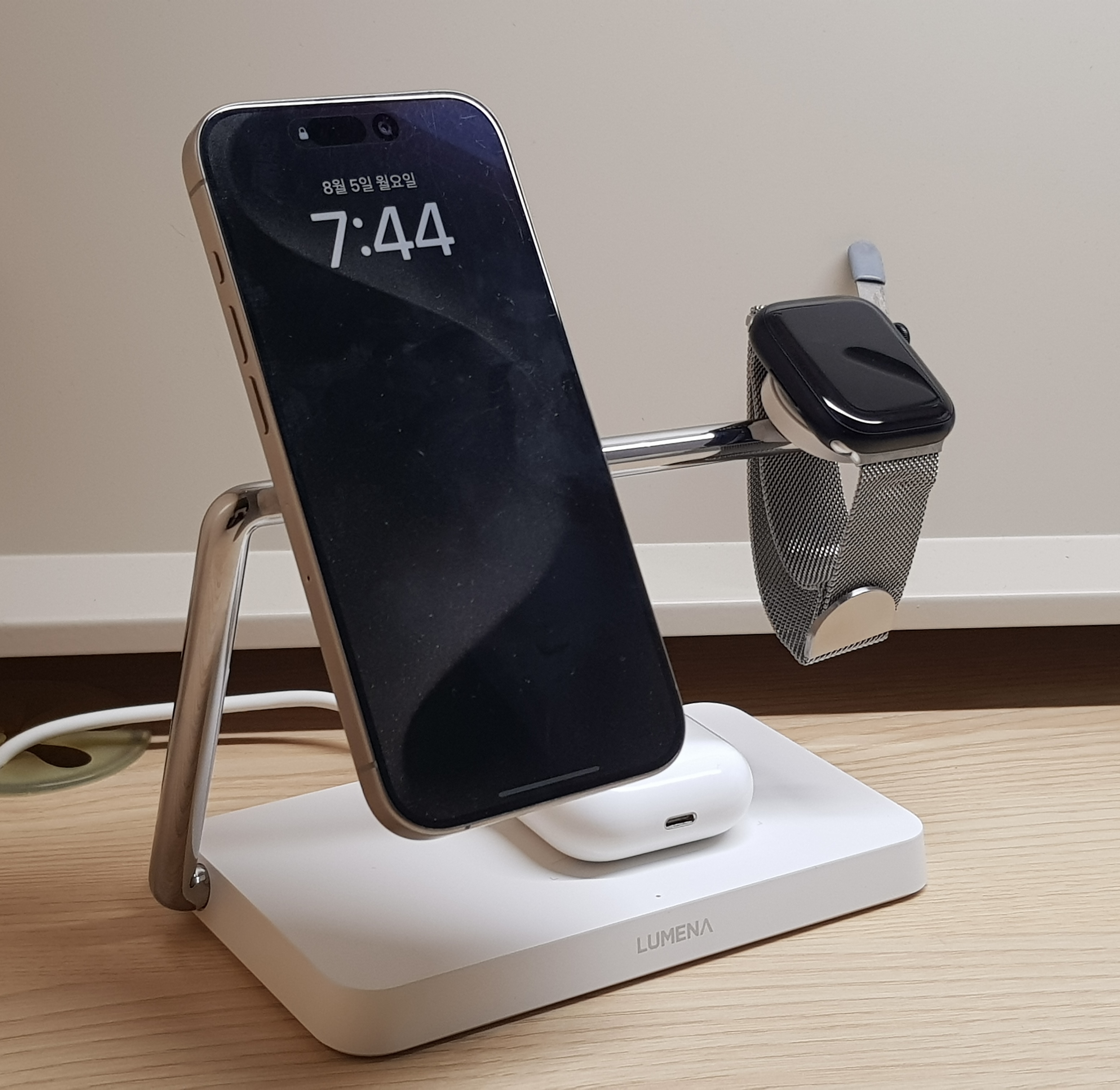충전기에 아이폰 15프로와 애플워치, 에어팟을 올려둔 모습이다.