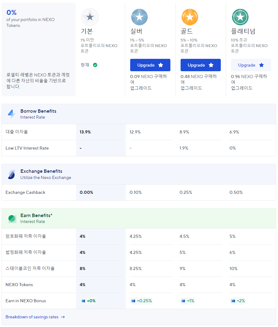 또한 Nexo 로열티가 최고 레벨일 때 기준이므로 자세히 이율을 확인하려면 아래에 있는 링크를 확인해주시면 된다.