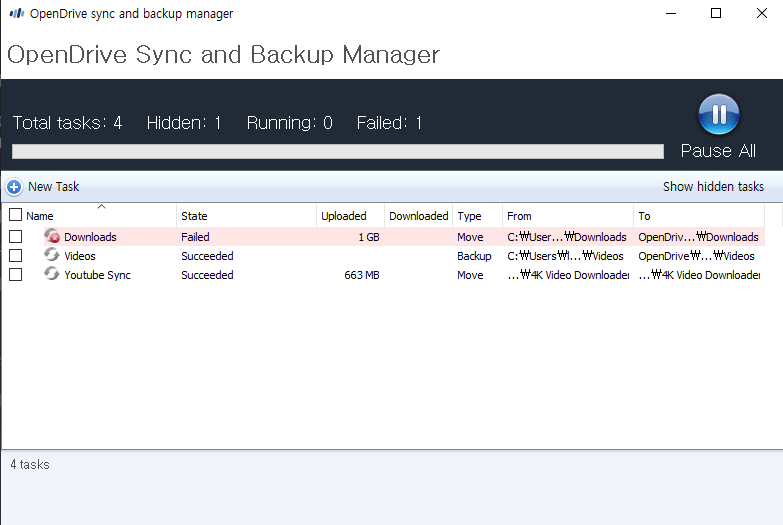 필자가 사용하는 OpenDrive의 백업 기능이다. New Task를 클릭하여 작업을 추가할 수 있는데,
