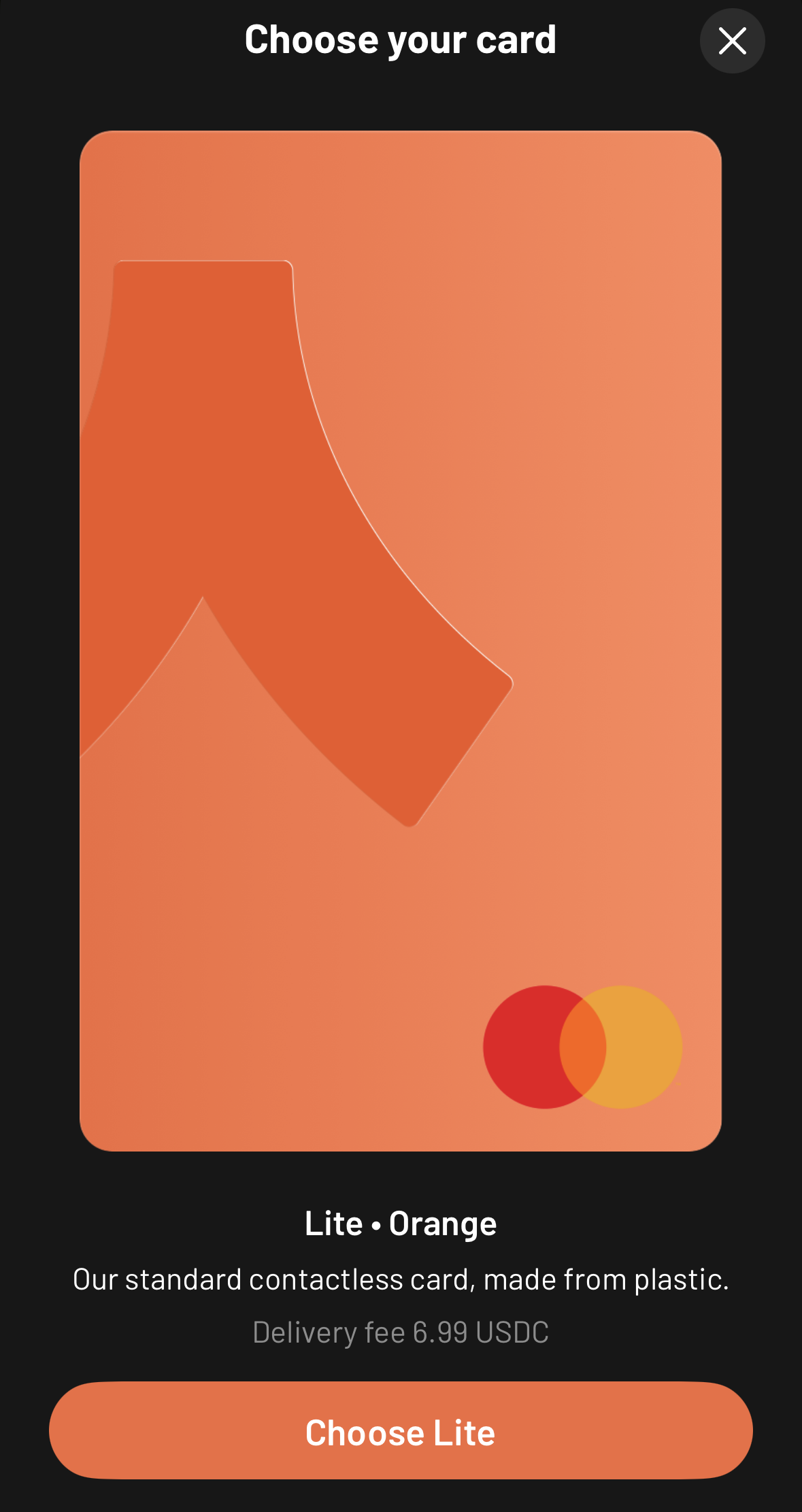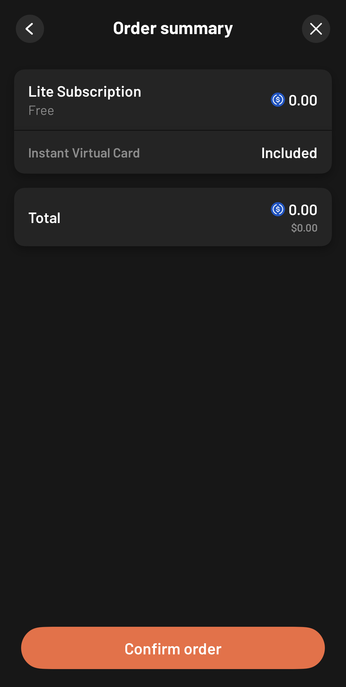 Lite는 연회비가 없기 때문에 총 0.00 USDC를 결제하는 것이다. Confirm order를 누르자.