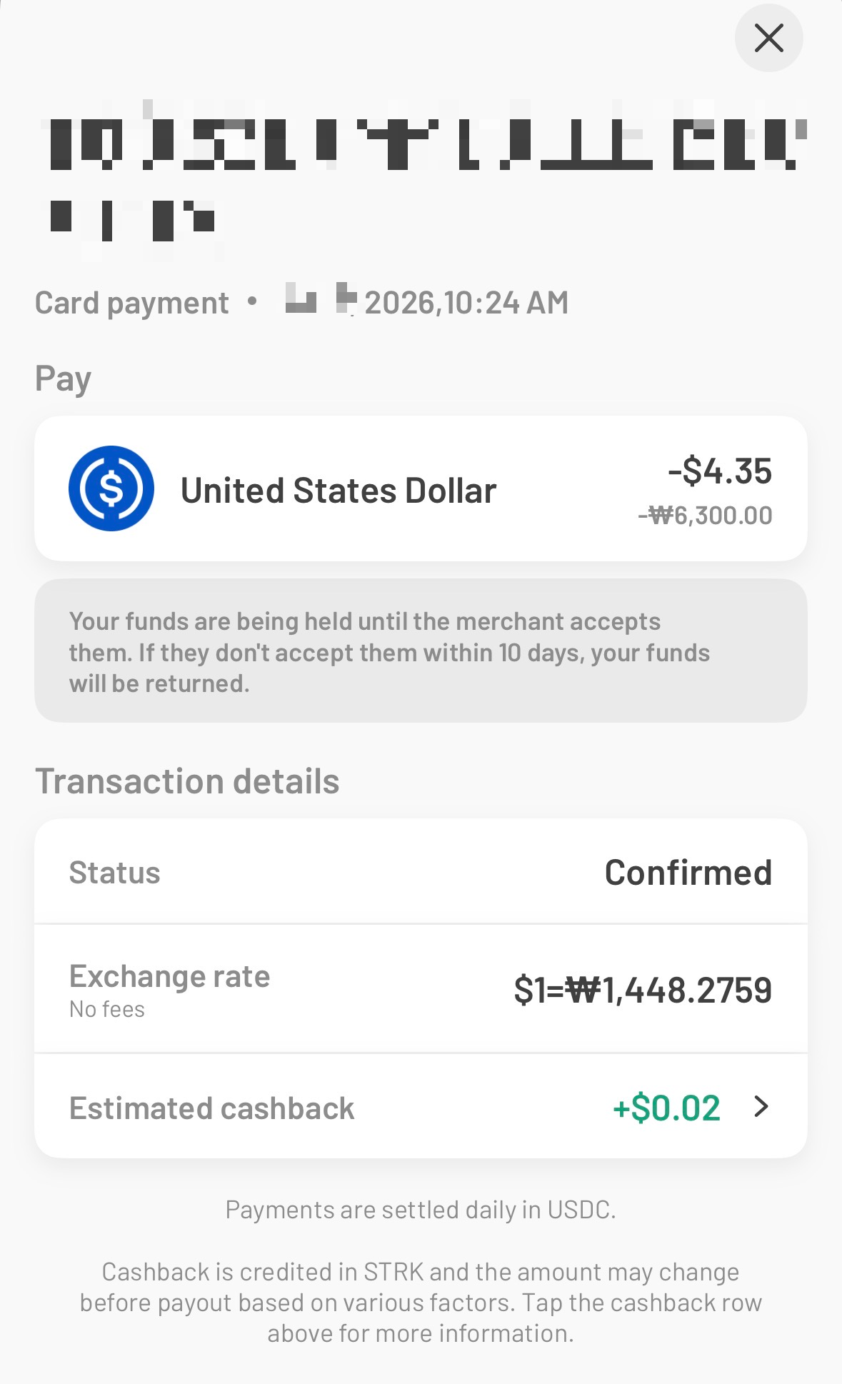 - 수수료 제로: 결제 수수료, FX 수수료, 입금 수수료가 모두 없어 1 USDC = 1 USD를 그대로 사용할 수 있다. 실제 결제 시 환율 차이도 약 0.4% 수준으로, Lite 등급의 0.5% 캐시백만으로도 충분히 상쇄 가능하다.