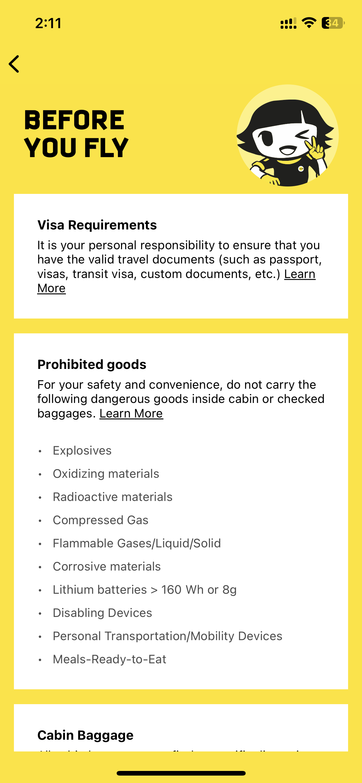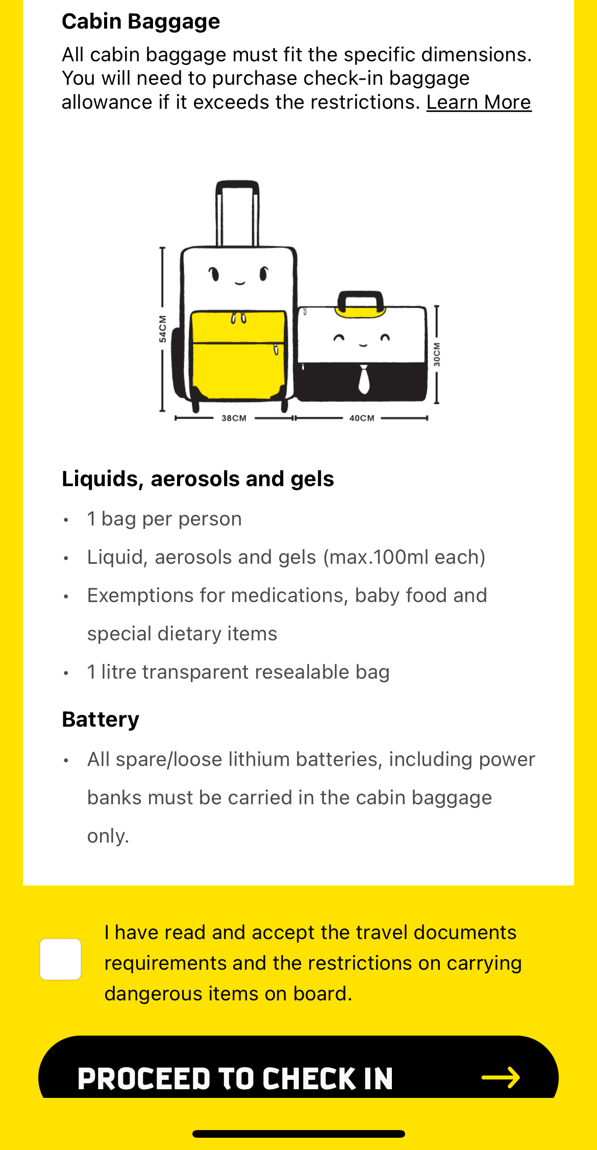 입국 비자와 관련된 안내문, 금지 품목, 수화물 안내다. 반드시 읽고 동의 버튼을 누른 뒤 Proceed to check in 버튼을 클릭한다.