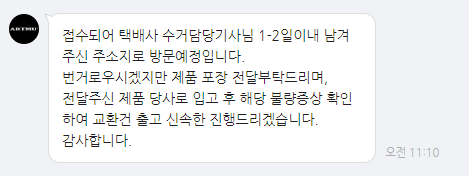 바로 반품 접수가 되었으며 수거 후 2~3일 뒤 교품을 받을 수 있었다. 월요일에 접수를 한다면 금요일에 받을 수 있는 것이다.