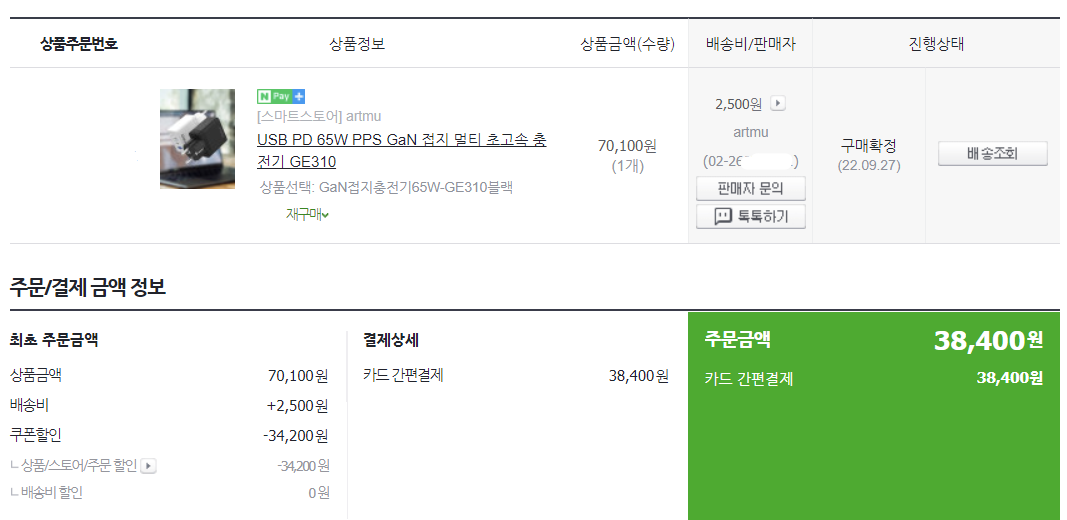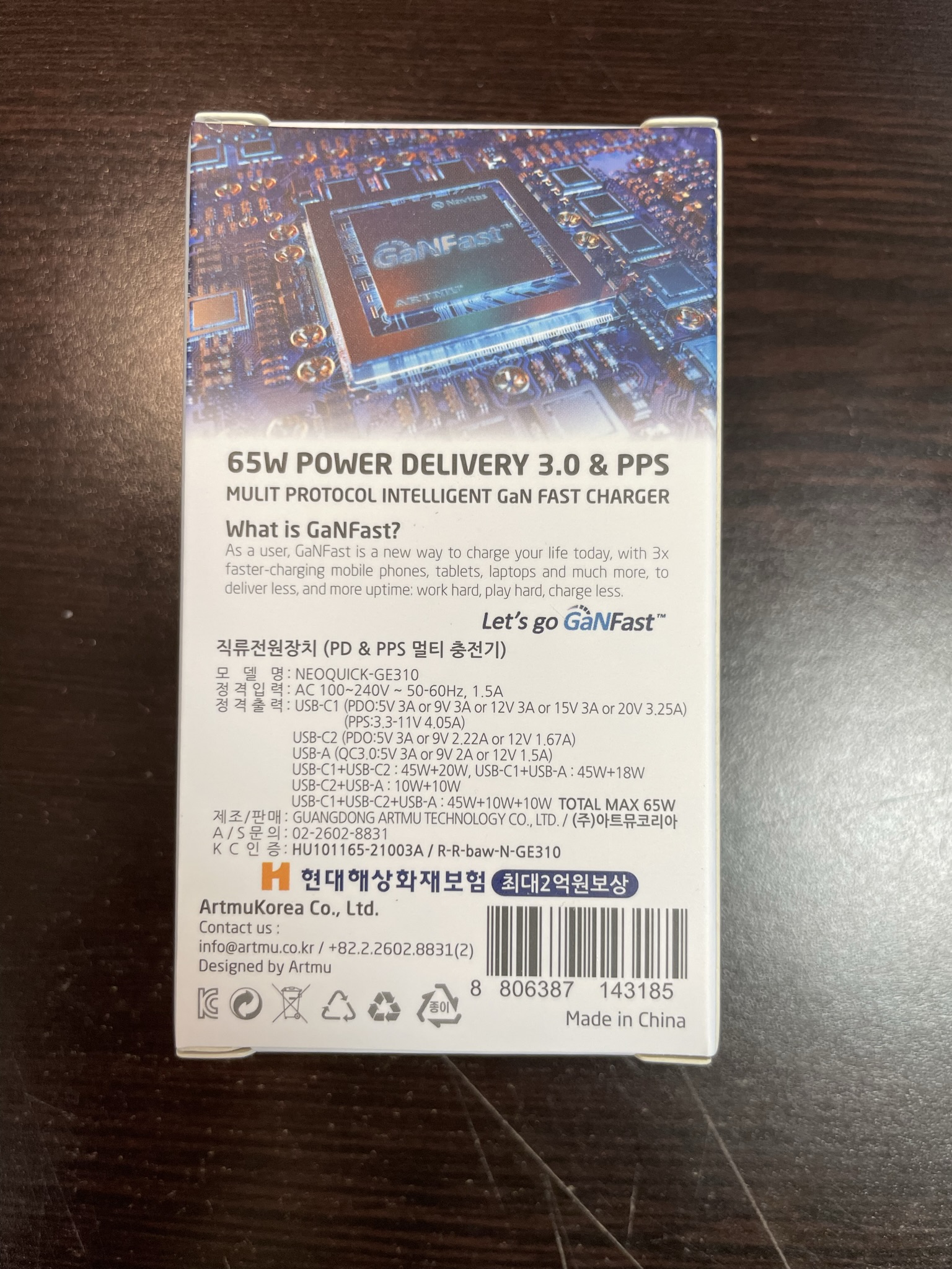 배송비 포함 38,400원이다. Baseus 65w 충전기와 비슷한 가격이다. 스펙도 같은데 한국 코드+접지라면 무조건 아트뮤를 구입해야 하지 않는가?