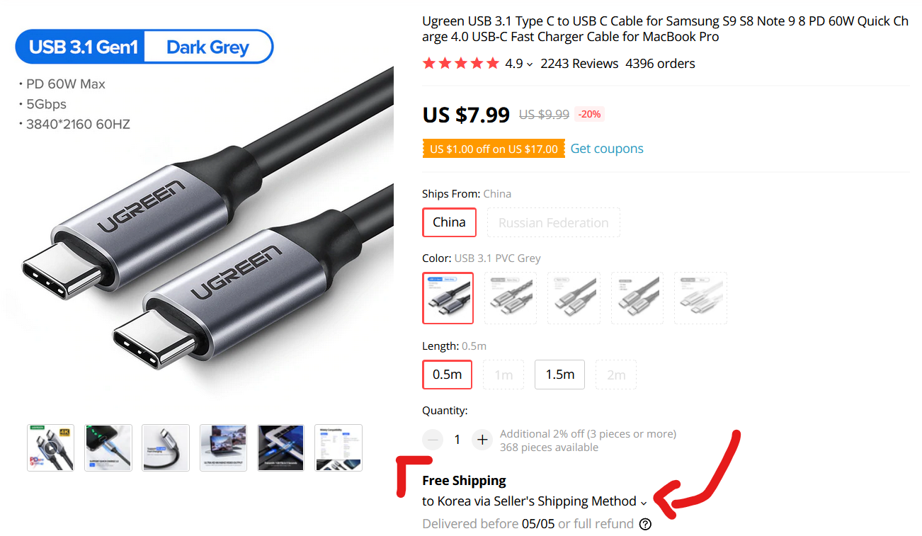 알리익스프레스에서 판매되는 대부분 Ugreen 제품은 셀러의 배송 방법을 통해서 배송된다고 설명되어 있다.