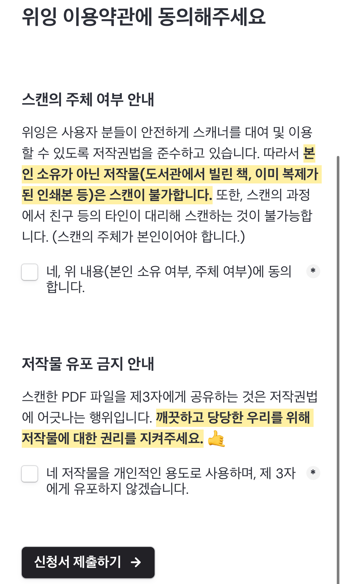 이 약관에는 스캔이 본인의 소유 책에 한해 이루어지며, 개인의 선택으로 스캔을 진행한다는 점, 그리고 스캔된 PDF 파일을 제3자에게 절대 공유하지 않겠다는 동의 내용이 포함되어 있다.