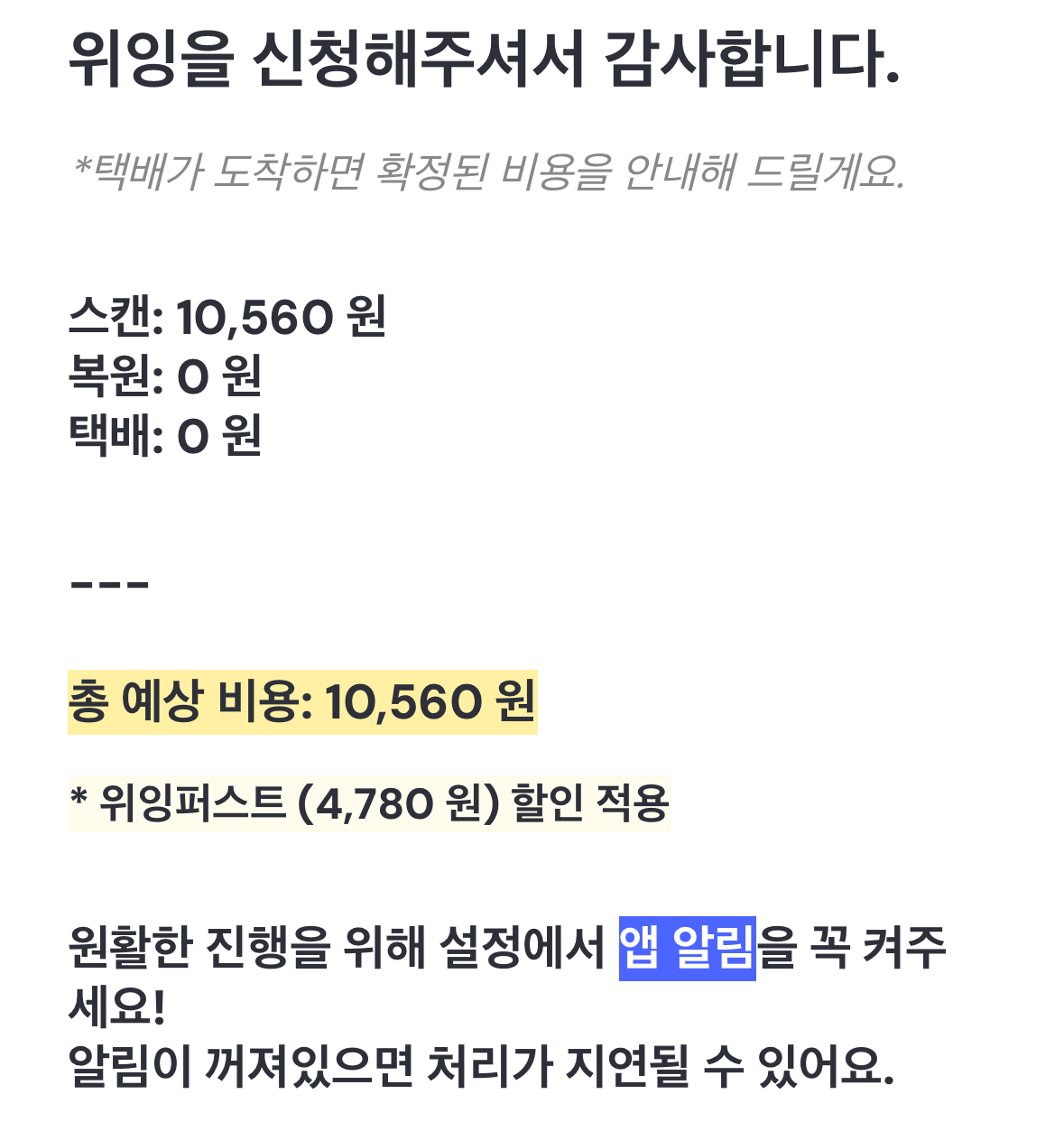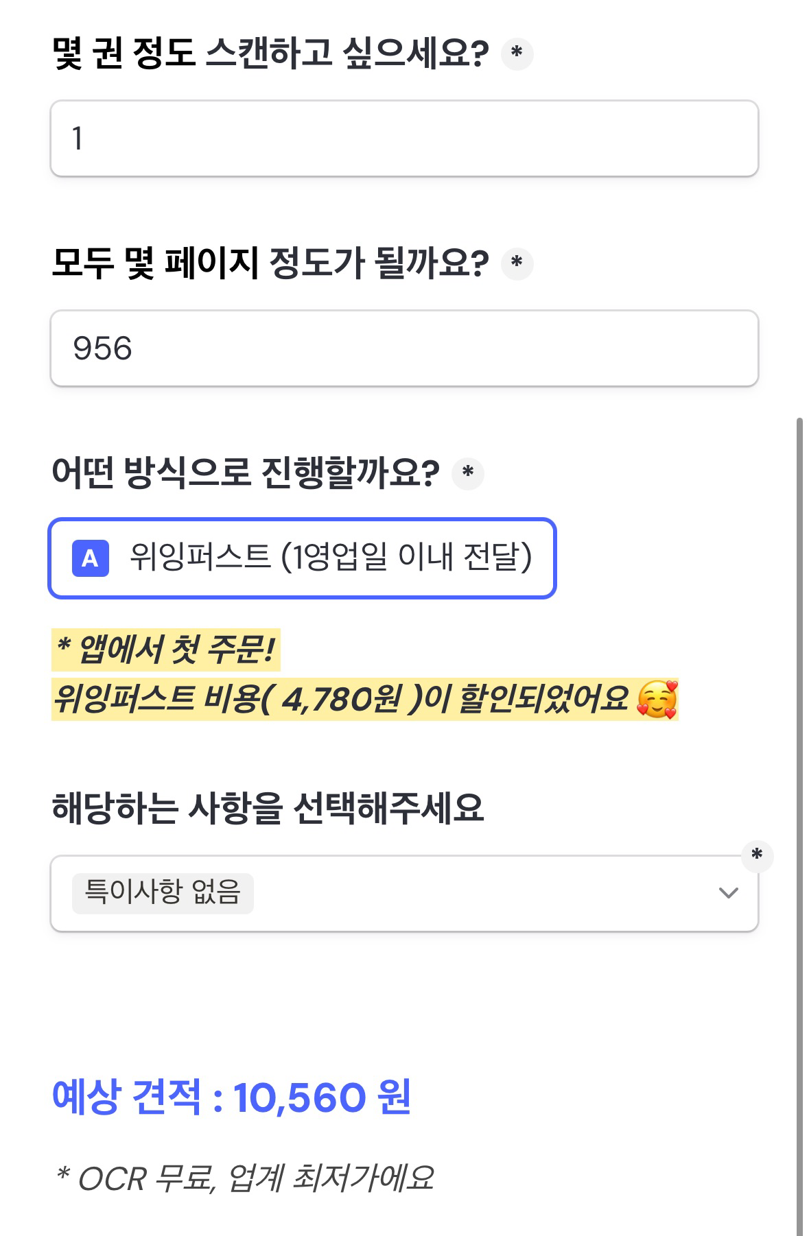 또한, 앱에서 첫 주문 시 ‘위잉퍼스트’ 서비스가 무료로 제공되는 것도 확인할 수 있다. 위잉퍼스트를 이용하면 보다 빠르게 PDF 파일을 받을 수 있다는 장점이 있다. 반면, 일반 스캔 서비스의 경우 완료까지 1~3일 정도 소요된다.