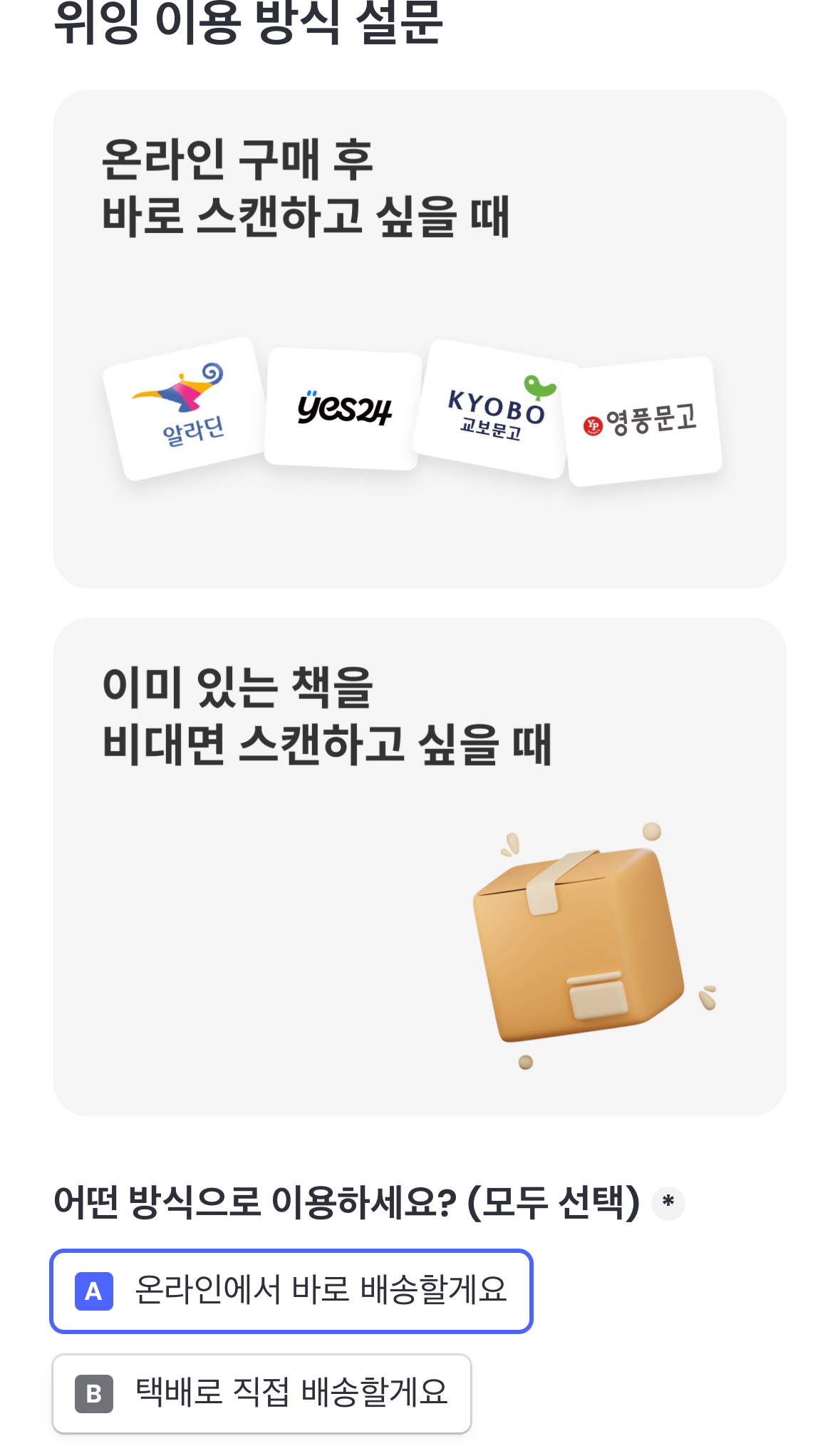 다음 단계에서는 온라인으로 진행할지, 집에서 택배로 책을 보낼지를 선택한다.