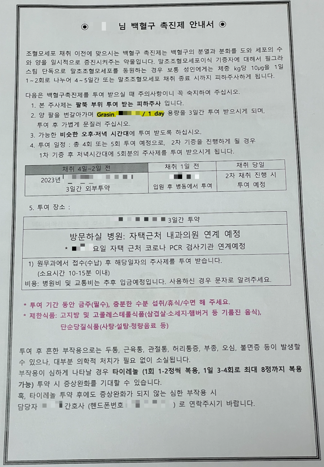 주사는 그라신이라고도 불리는 백혈구 촉진제다. (약 종류는 여러개인데 필자는 그라신을 받았다.)