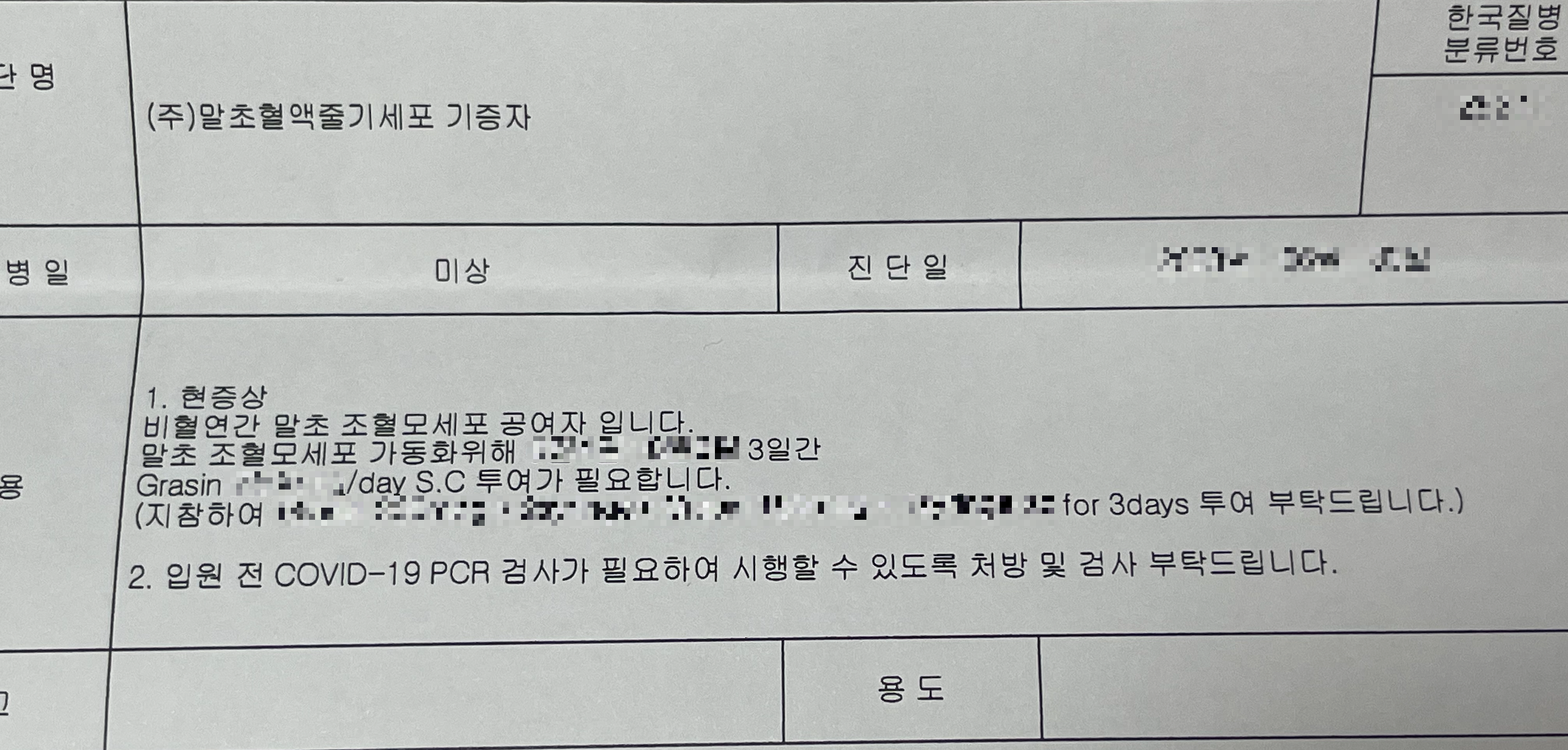 주사 맞기 하루 전, 기관에서 주사 + 소견서 3쌍과 입원, PCR 검사 안내서를 퀵으로 보내준다. 그라신이 비싸기 때문에 빨리 배송해야 하기 때문이다.