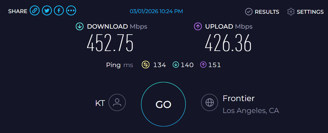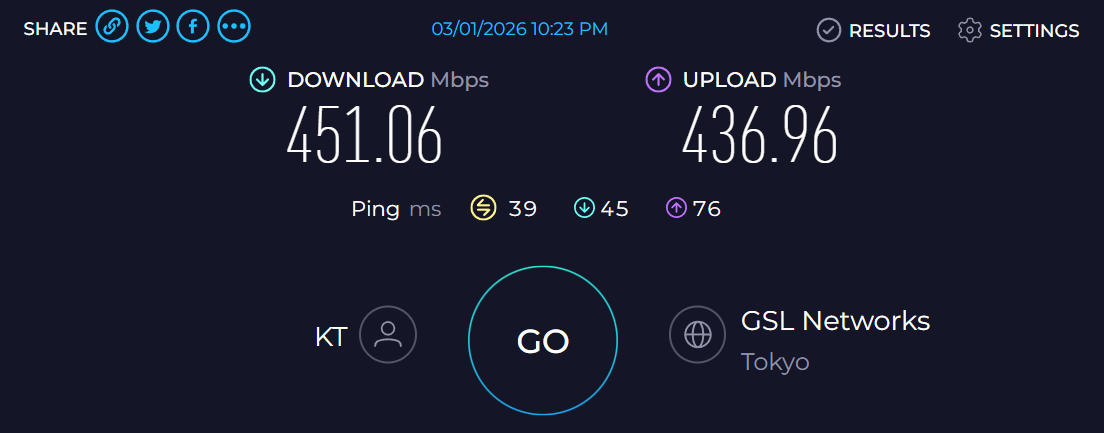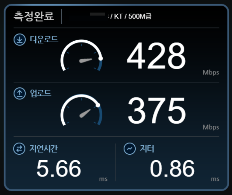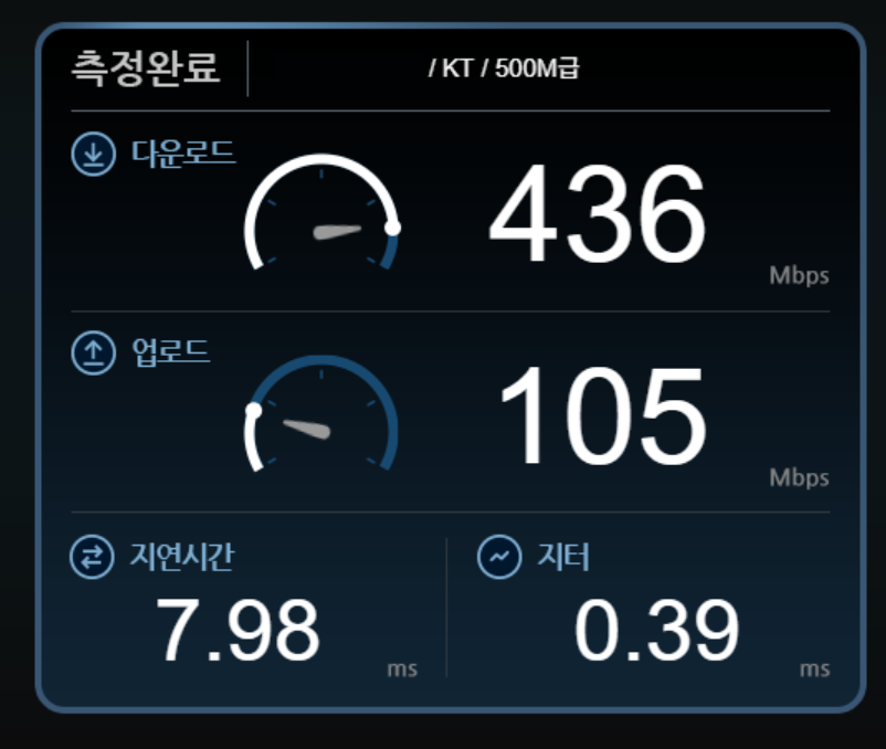 측정은 밤 10시 이후에 진행했으며, 필자는 KT 500M 인터넷을 사용하고 있다.