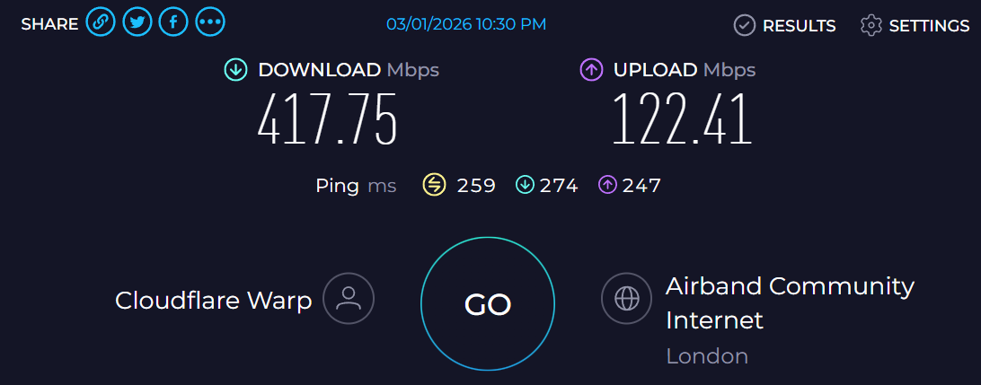 유럽 서버는 다운로드 속도가 WARP+가 월등히 높았다. 확실히 지구 반대편으로 가니 효과가 나타나는 듯 보인다.