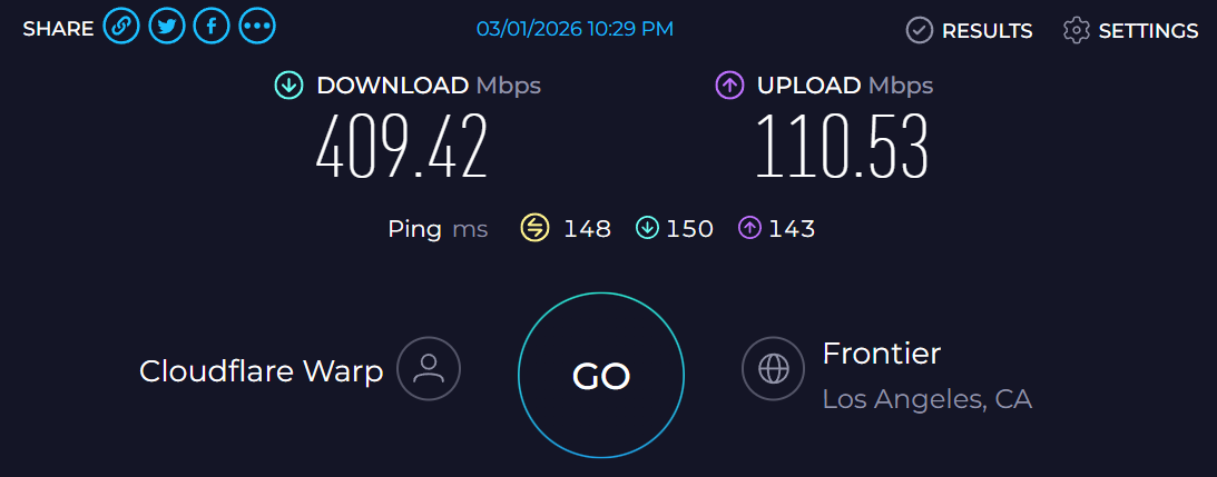 이 결과에서는 WARP+가 더 부정적인 결과를 보였다. 다운로드, 업로드, 핑 모두 불리했다.