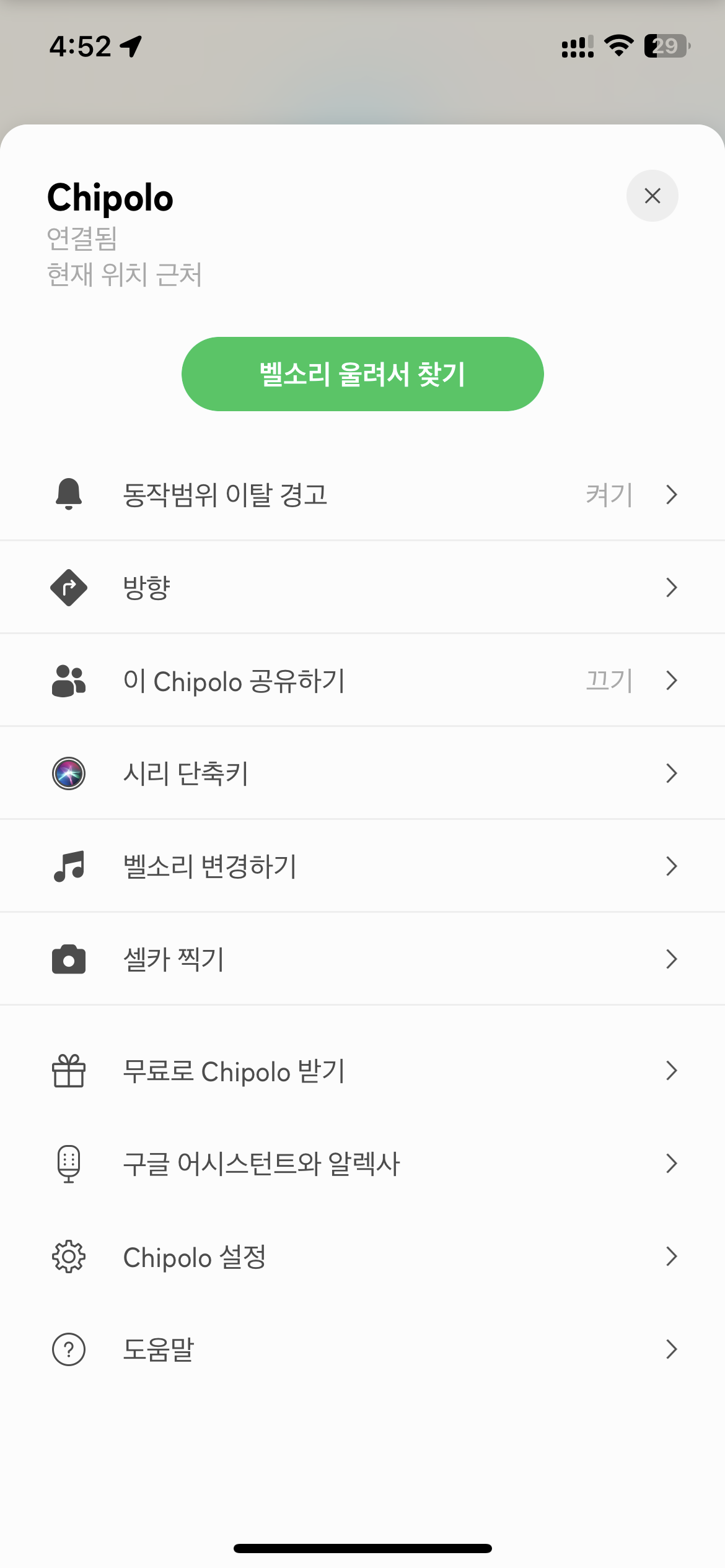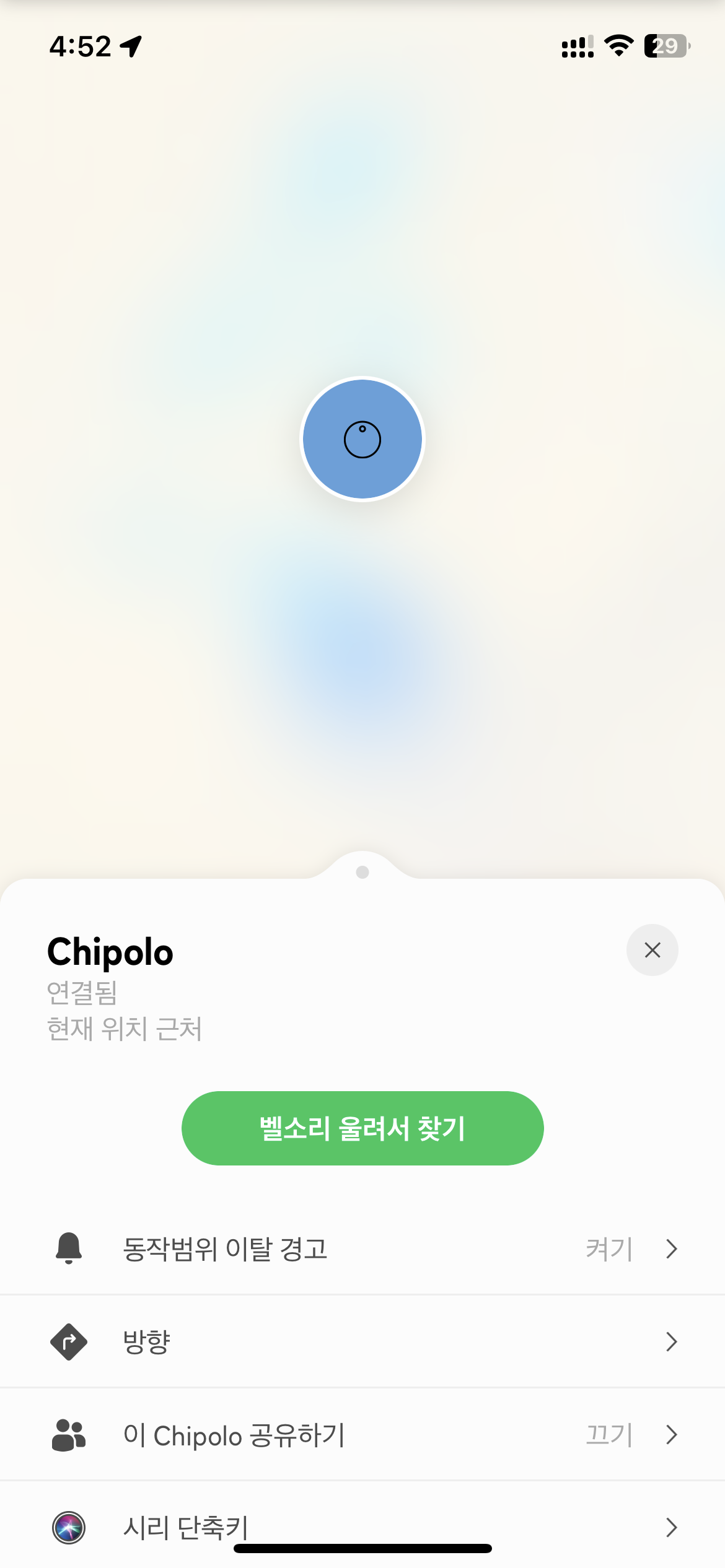 치폴로와 마지막으로 연결되었던 위치를 앱에서 지도를 통해 확인할 수 있다. 치폴로에 GPS 센서가 있는 게 아니라, 치폴로와의 마지막 연결 지점을 휴대폰이 지도에 표시해주는 것이다.
