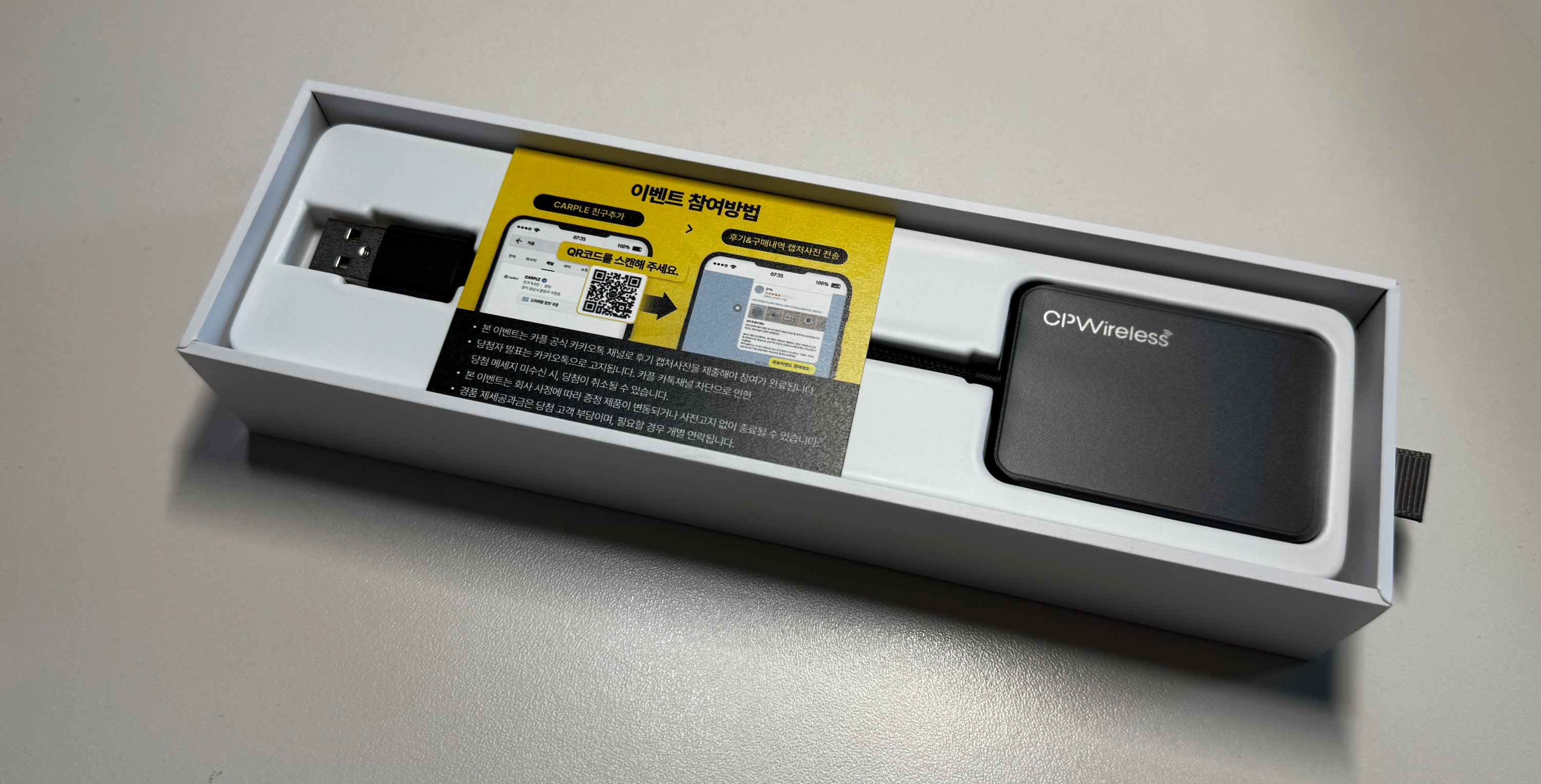 이벤트 안내장과 본체가 보인다. 본체 아래에 C타입 젠더가 있어서, C타입을 지원하는 차량에 연결하는 경우 이 젠더를 활용하면 되겠다.