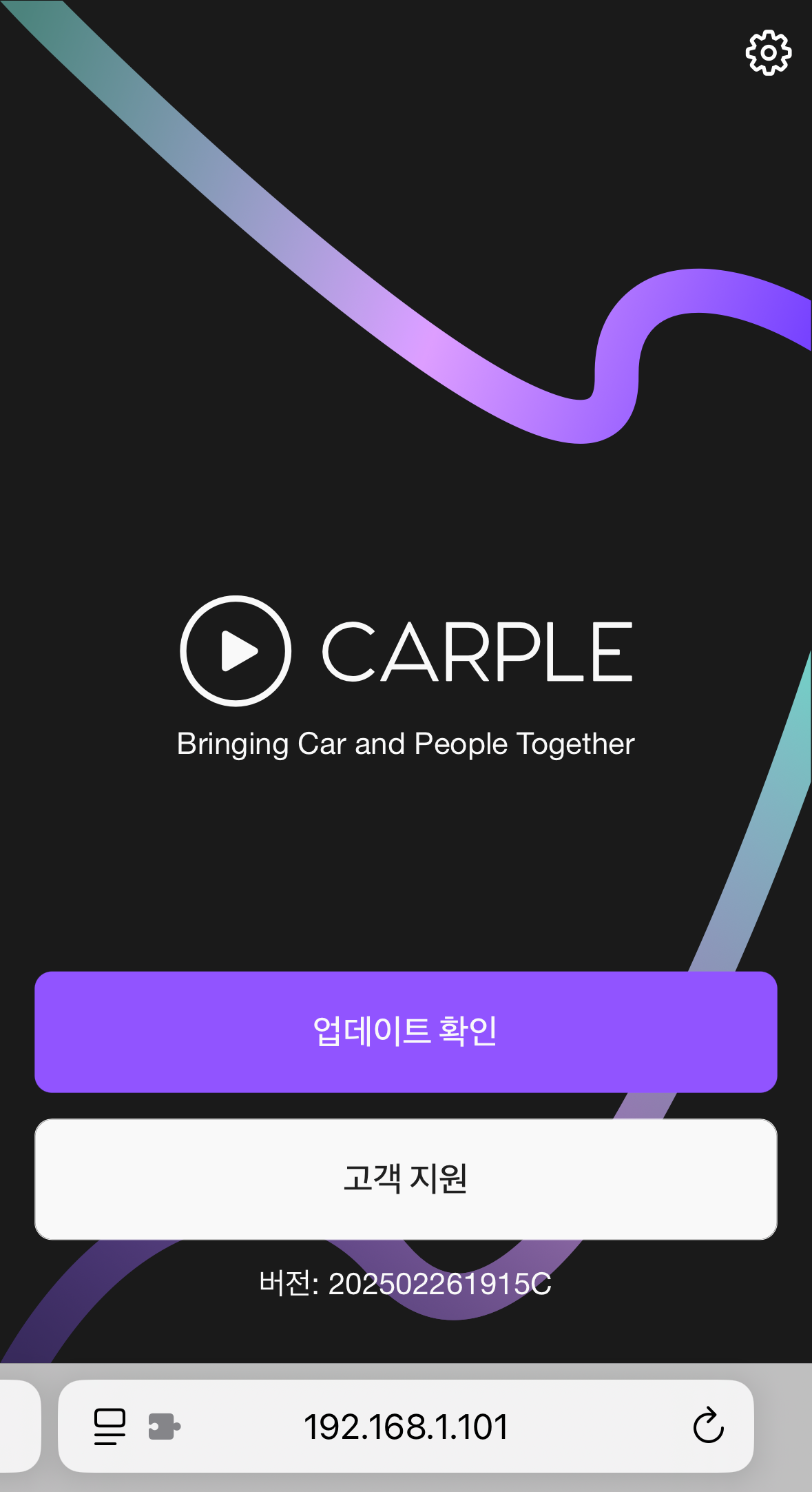 위 사진은 메인 화면이다. 우측 상단에 설정 버튼이 있고, 하단에는 ‘업데이트 확인’ 버튼과 ‘고객 지원’ 버튼이 있다.