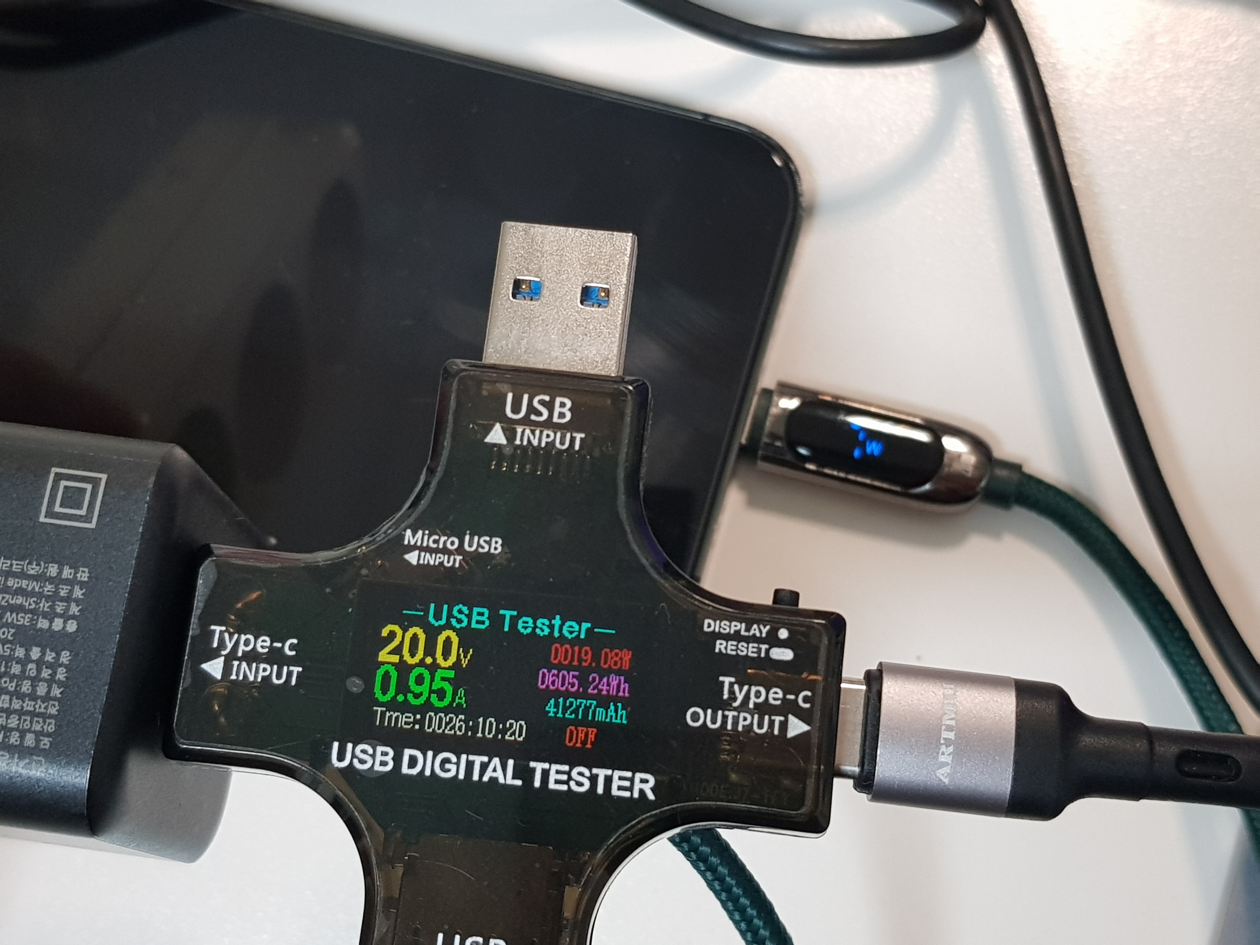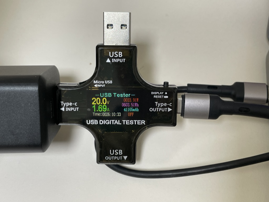 두 포트 33W 정도 출력된다. 어느 포트에 꼽든지 동일한 출력 속도다. 이론상으로는 20V, 1.75A가 출력되야겠지만 실제로는 20V, 1.69A(33.91W)가 출력됐다.