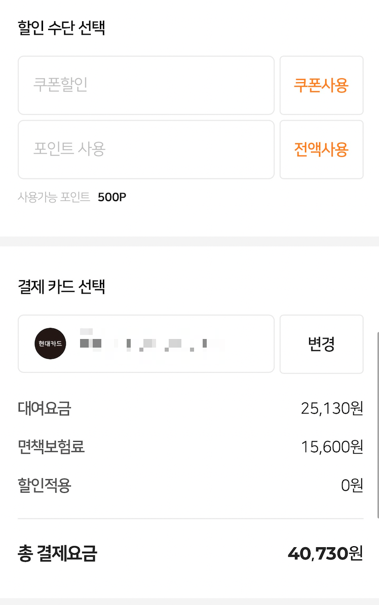 어려운 것 없이 시간 설정, 보조운전자, 자동차종합보험, 할인수단과 결제 수단을 선택하고 결제하면 예약은 완료된다.