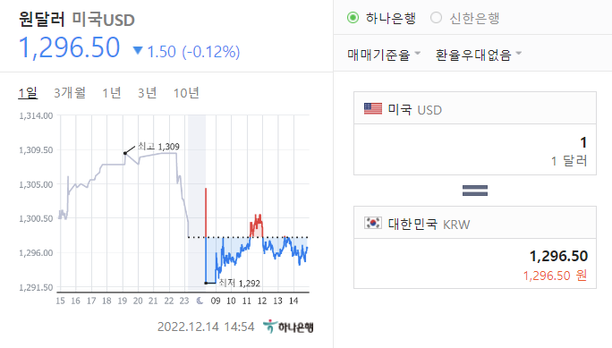 22년 12월 14일 기준 하나은행 USD (매매기준율)