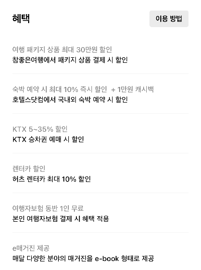 사실 KTX 쓰려고 가입했는데 막상 내가 타는 비인기 노선은 할인율도 전혀 없었고, 호텔스닷컴만 쓰고 해지할 것 같다.