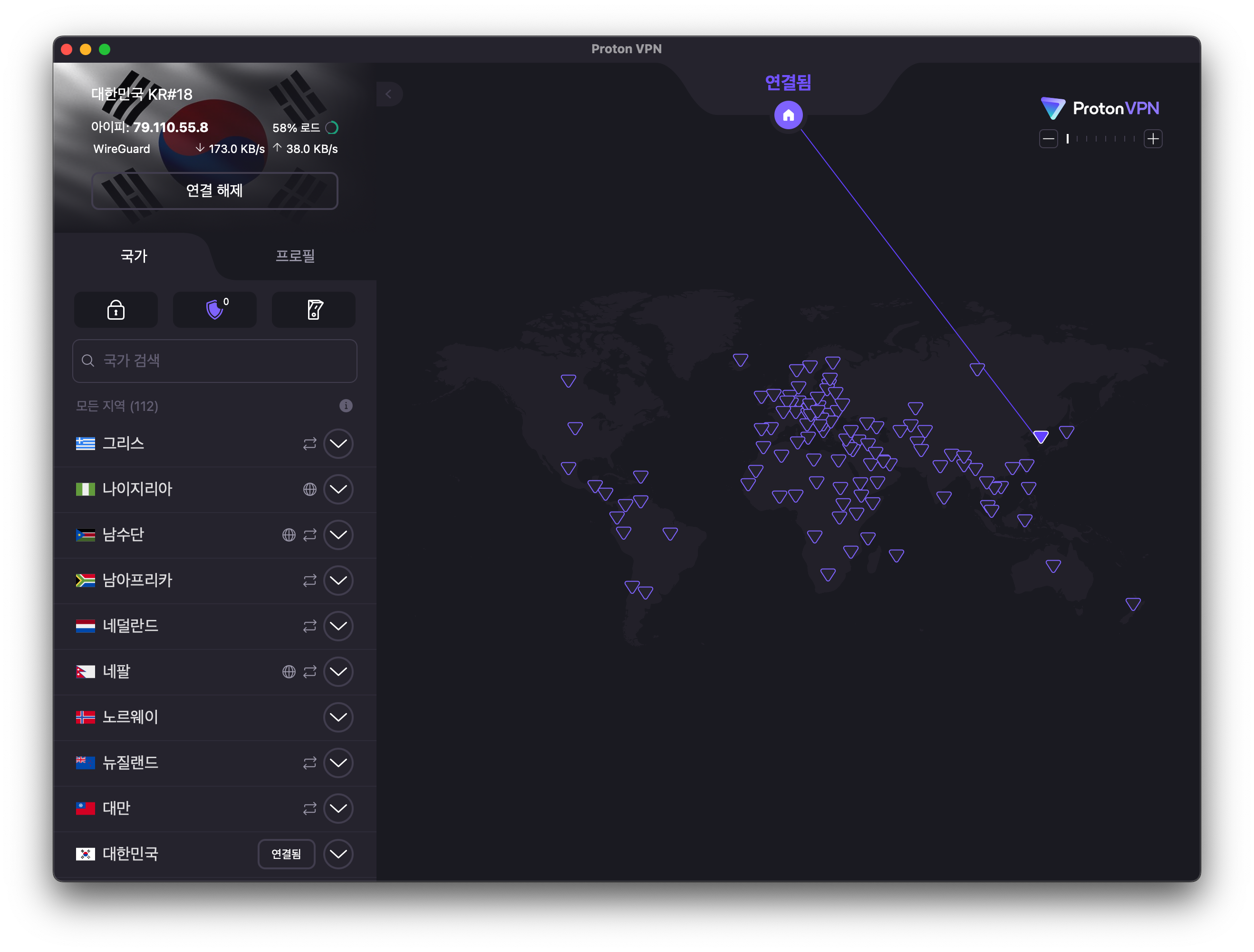 우리나라는 알 수 없는 이유로 인해 여전히 Proton VPN의 실제 서버가 우리나라에 위치하지 않고 있다. 아마도 네트워크 관련 망 이슈 때문일 가능성이 있다. 실제 서버는 일본에 위치해 있는 것으로 보이며, 사용자가 접속할 때 IP 주소의 위치는 대한민국으로 표시되지만 실제로는 일본의 서버와 통신하는 구조다.