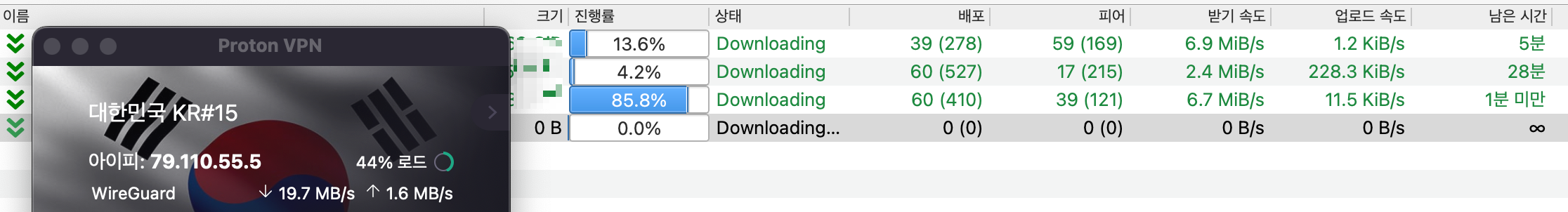 무작위로 토렌트 파일을 다운로드했을 때, Proton VPN의 속도는 매우 만족스러웠다. 기다리다 보면 30MB/s를 넘는 경우도 자주 발생했다. P2P 용도로 VPN을 찾고 계신다면, Proton VPN은 충분히 적합한 선택이라고 말씀드릴 수 있다.