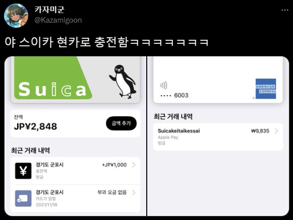 아쉽게도 우리나라 오프라인 가맹점에서는 사용이 불가능했지만, 애플월렛에 있는 일본의 교통카드인 스이카 잔액 충전이 가능했다고 한다. 실제로 현대카드 앱에서 승인 내용을 확인할 수 있었다.