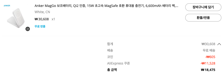 한 달 전쯤 알리익스프레스에서 Anker의 맥세이프 호환 보조배터리를 구매했다. 정가는 약 3만 원 정도로 보였지만, 코인 할인을 활용해 1만 8천 원에 구매할 수 있었다.