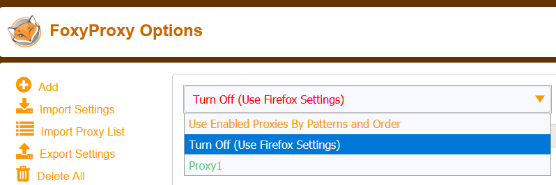 이렇게 FoxyProxy Options 페이지에서도 현재 사용하는 프록시를 변경할 수 있다.