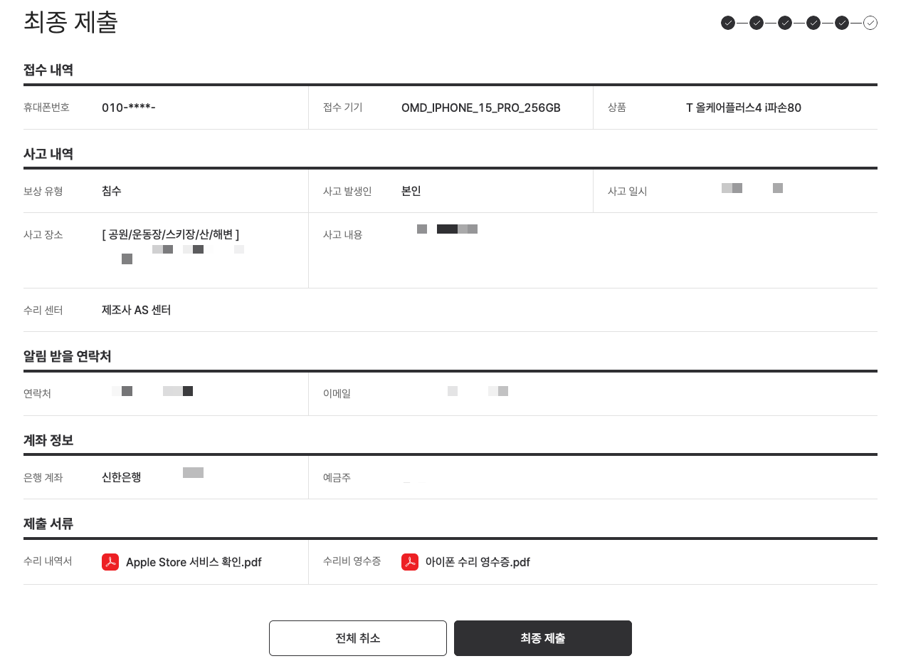 수리 내역서와 수리비 영수증이 필요했다. 필자는 가로수길에 있는 애플 스토어에서 조치를 받았는데, 처음부터 직원이 보험 가입 여부를 물어보았다. (아마 수리비가 많이 청구되는 부분을 미리 안내하려는 듯했다)