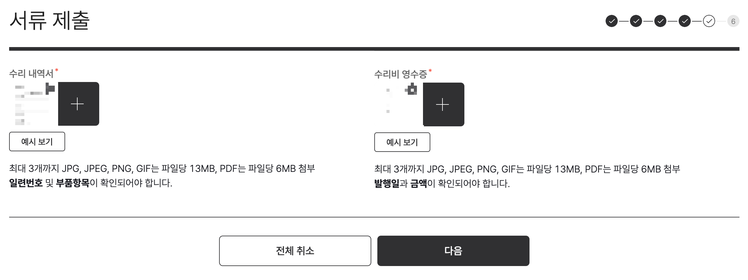 수리 내역서에는 반드시 일렬번호와 부품 항목이 포함되어야 하며, 수리비 영수증에서는 발행일과 결제 금액이 확인되어야 한다.