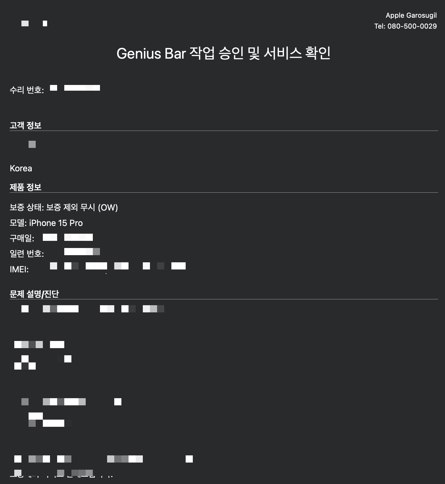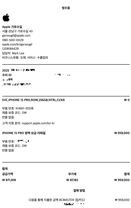 애플 지니어스 바 기준 수리 내역서와 수리비 영수증은 아래 사진을 참고하면 된다.