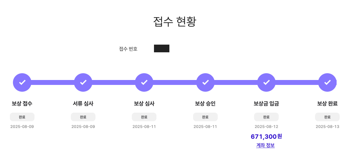 필자는 접수를 휴일에 진행했다. 11일이 월요일이었고, 당일에 심사가 완료되었으며 보상금은 다음 날 입금되었다. 완료일은 13일로 표시되어 있었지만, 실제로는 전날 입금되었으므로 사실상 2영업일이 소요된 셈이다.