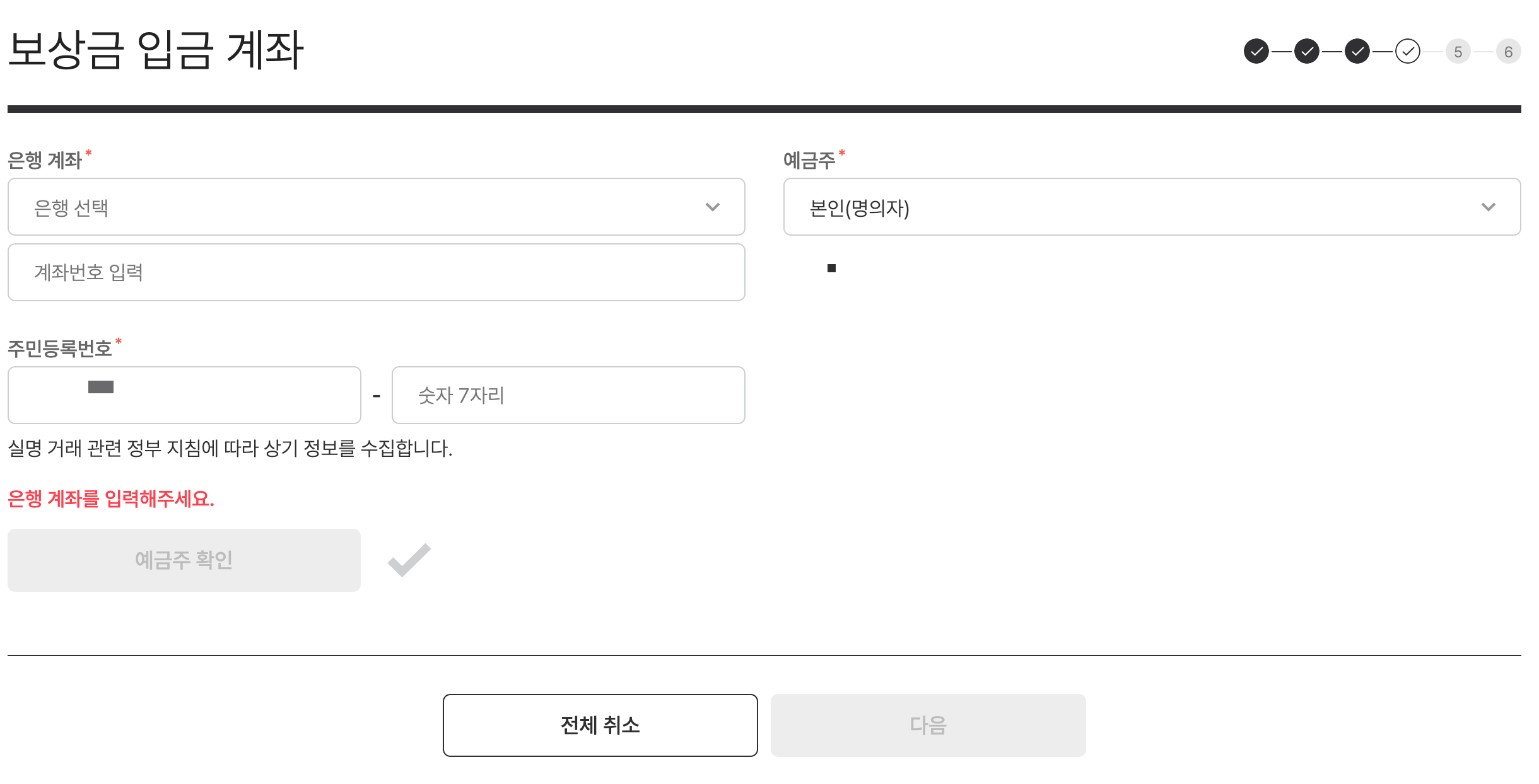 보상금을 받을 계좌 정보를 입력한다. 은행명, 계좌번호, 예금주, 주민등록번호를 입력한 뒤 ‘예금주 확인’ 버튼을 클릭한다.