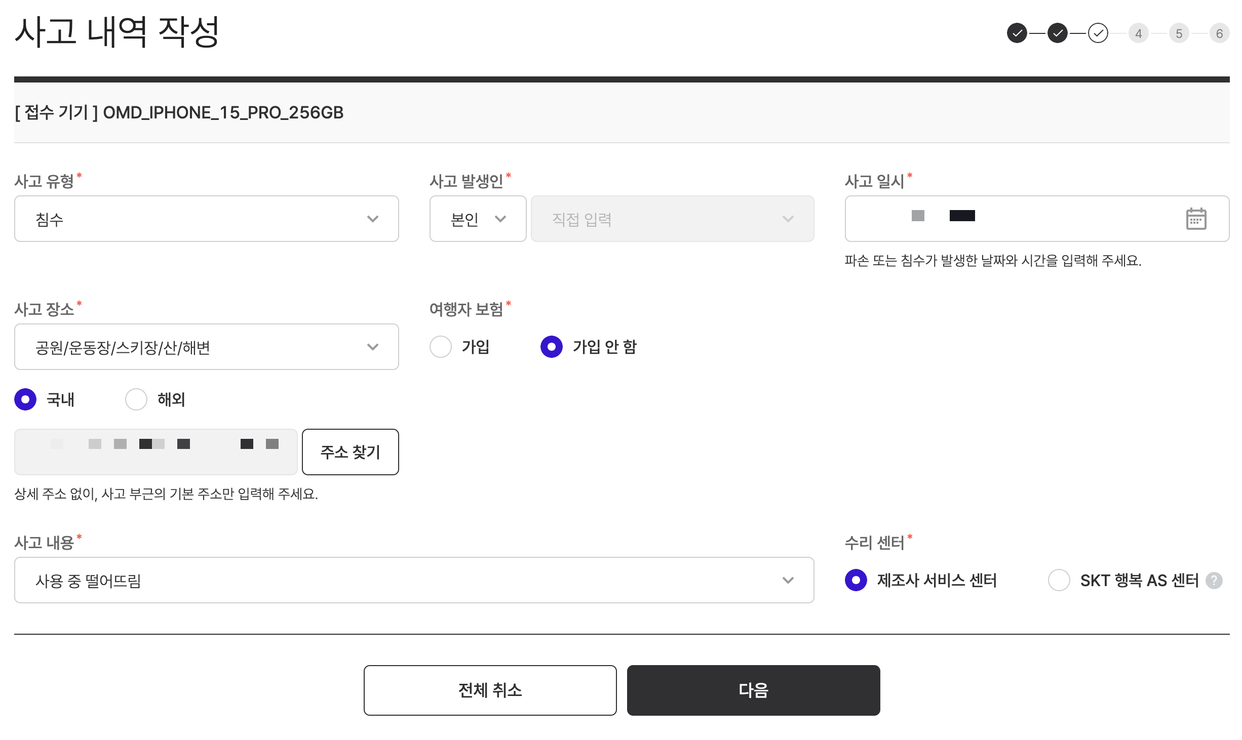 사고 내역을 작성한다. 사고 유형, 일시, 장소, 내용, 수리 센터를 선택하거나 입력한다.