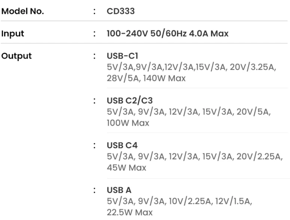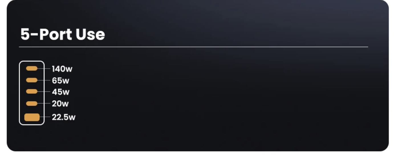 포트를 하나만 사용할 때는 1번 포트에서 140W, 2~3번 포트에서 100W, 4번 포트에서 45W, 마지막으로 USB-A 타입인 5번 포트에서 22.5W 출력을 지원한다.