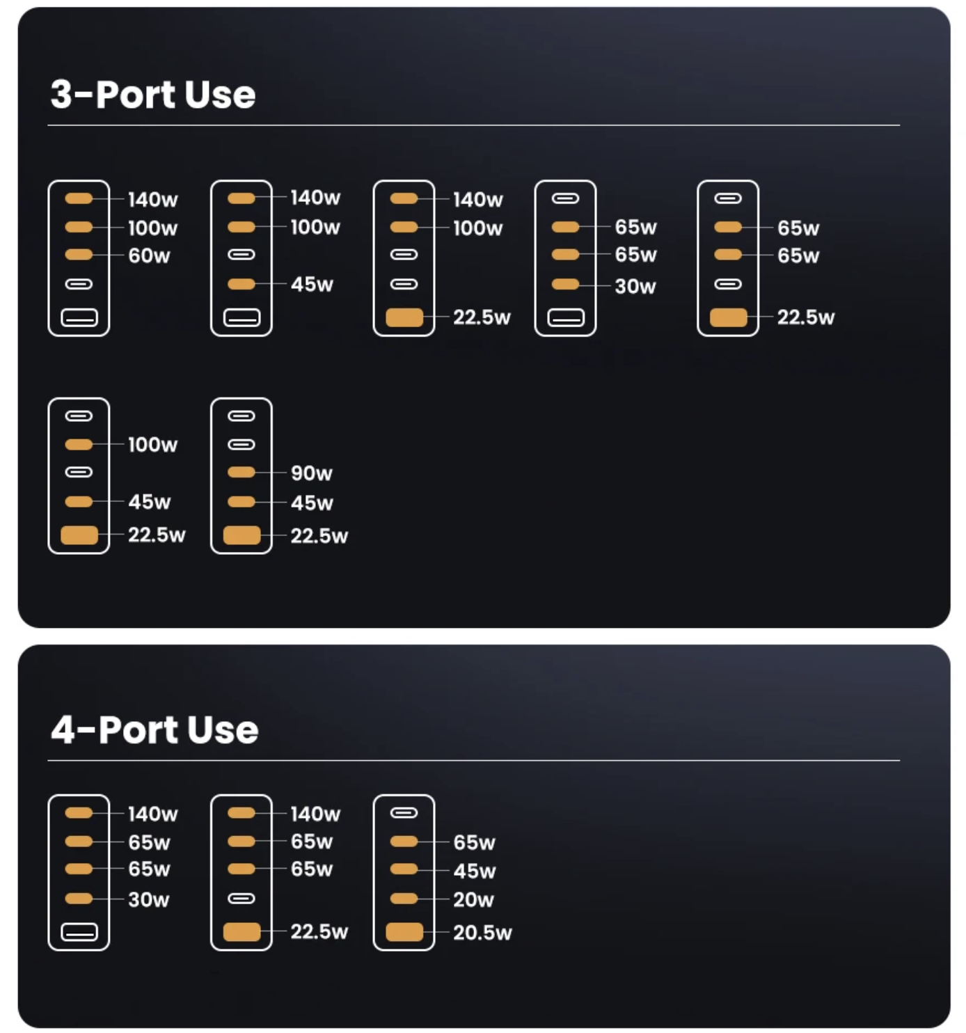 5개의 포트를 모두 사용할 경우 각각 140W, 65W, 45W, 20W, 22.5W 출력을 지원한다.