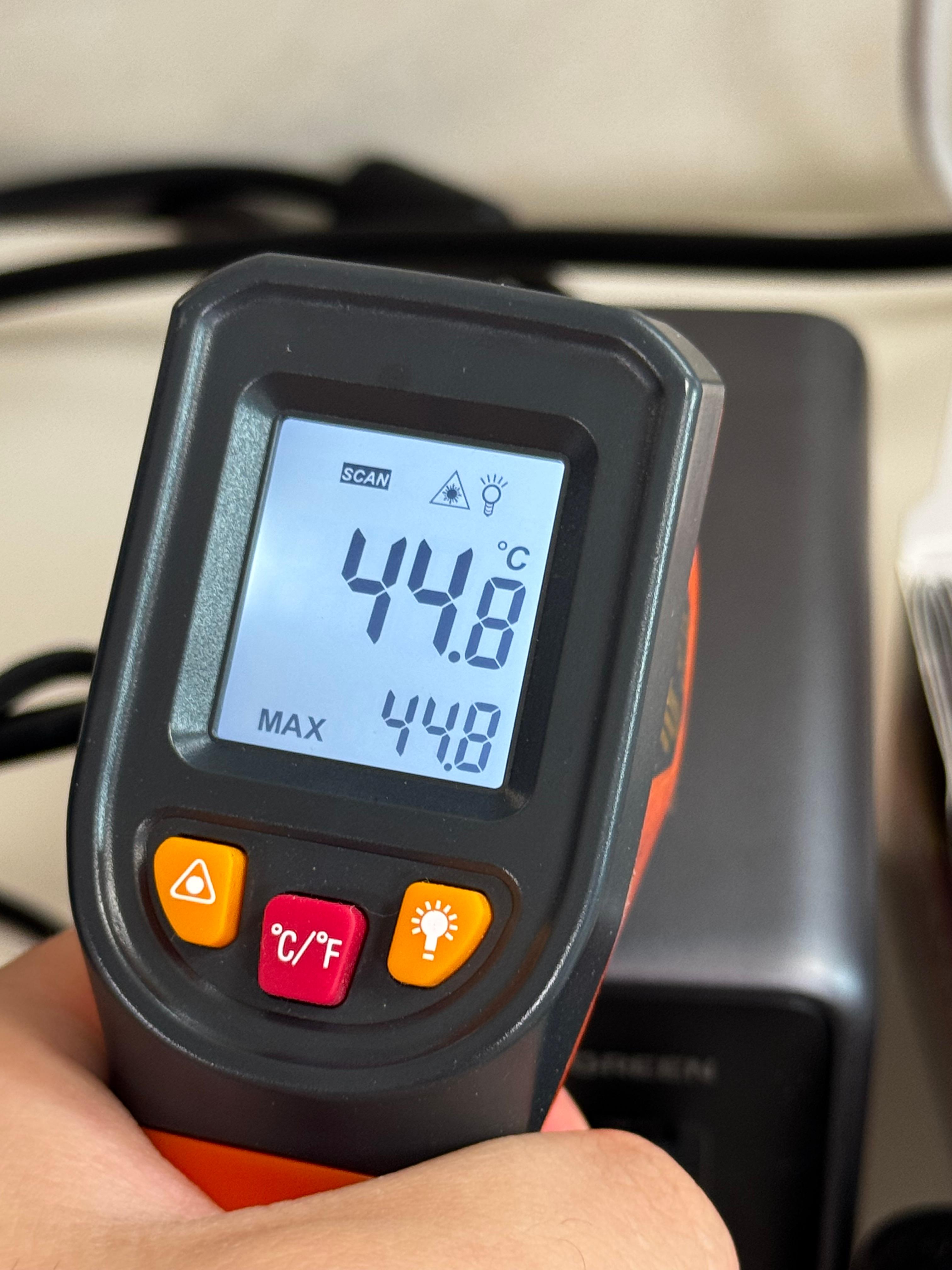 모든 포트에서 최대 출력을 테스트하기에는 장비가 부족해, 1번 포트로 140W급 보조배터리를 충전하고, 동시에 70W급 노트북을 충전했으며, 나머지 포트에는 약 20W의 아이폰과 15W의 쿨러를 연결해 테스트했다. 실내 온도는 24도였다.