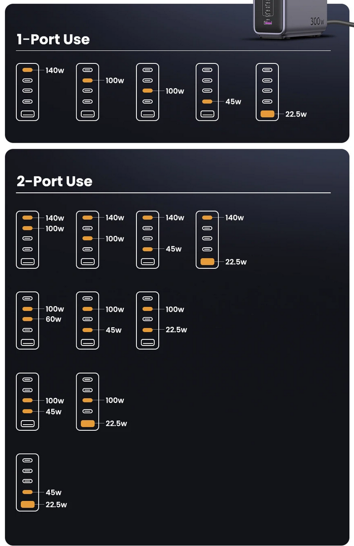 포트를 하나만 사용할 때는 1번 포트에서 140W, 2~3번 포트에서 100W, 4번 포트에서 45W, 마지막으로 USB-A 타입인 5번 포트에서 22.5W 출력을 지원한다.