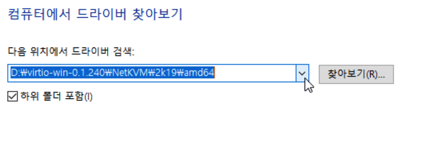 찾아보기 클릭 > CD(D드라이브) > virtio > NetKVM > (자신OS) > amd64 클릭 후 확인