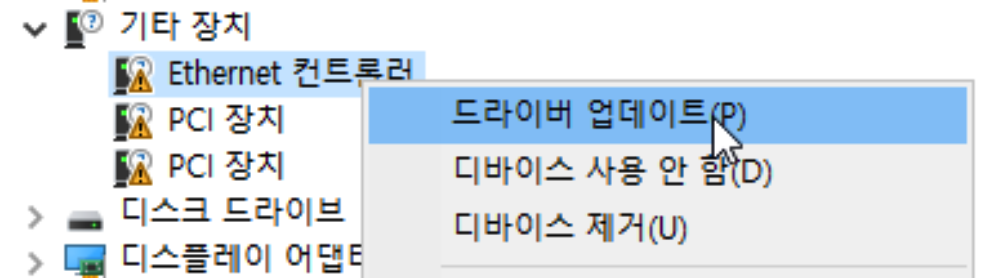 Ethernet 컨트롤러 우클릭 > 드라이버 업데이트