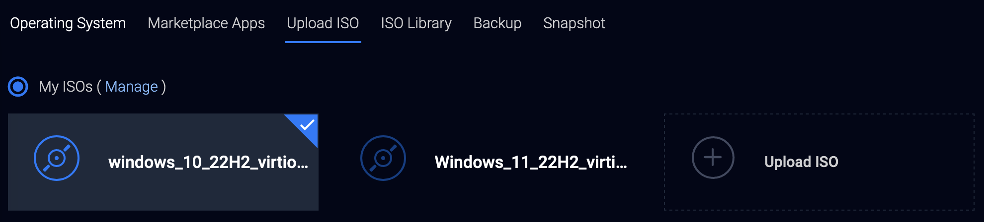 Server Type 부분에서 Upload ISO를 클릭하고 방금 업로드한 ISO 파일을 클릭한다.